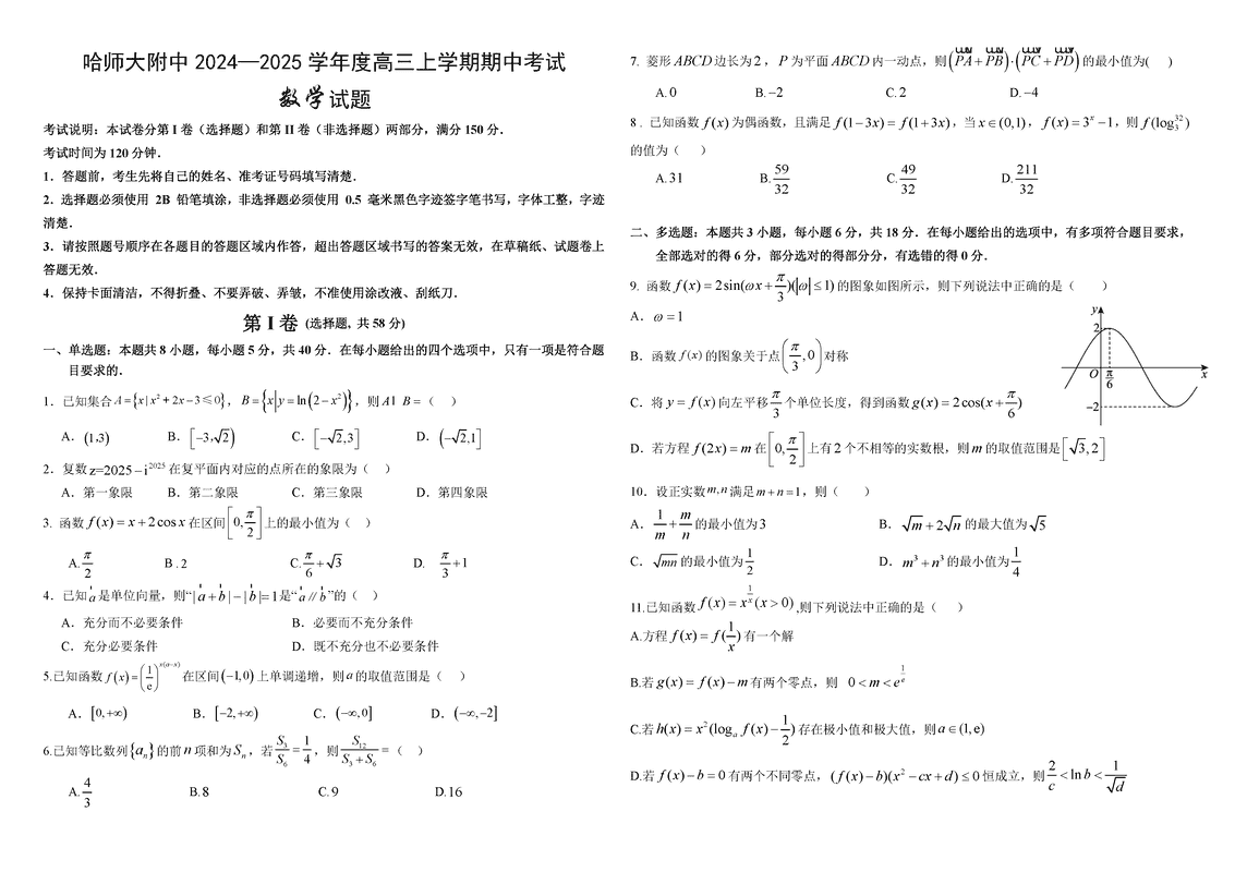 哈师大附中2025届高三上学期期中数学试题及答案 时间:2024-11-21 01:57 黑龙江 数学试题 哈师大附中2025届高三上学期期中数学考试已于近日开考,为方便考生考后及时查看考试情况,查漏补缺、弥补不足,本文整理了试题答案解析相关信息! 汇总:哈师大附中2025届高三上学期期中试题及答案汇总 数学试题及答案解析