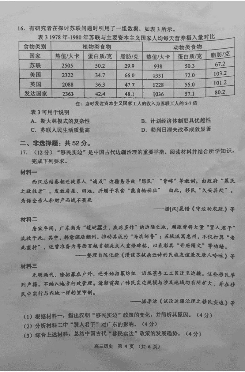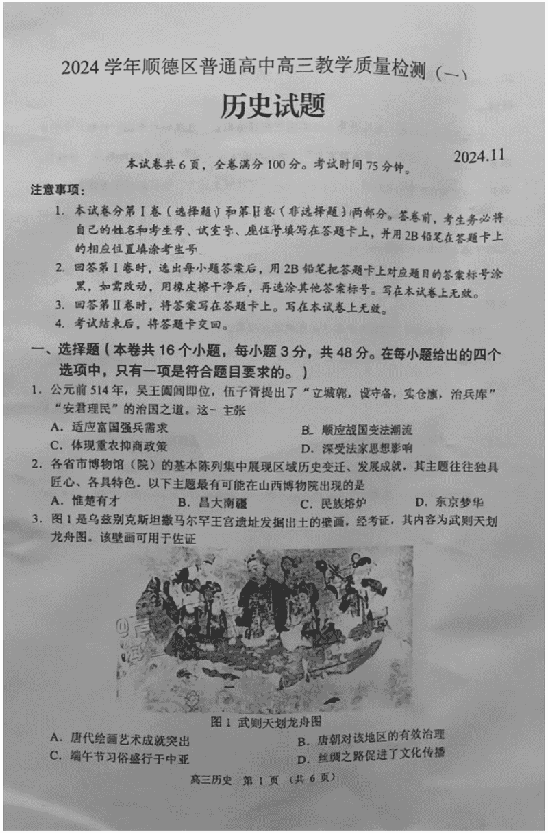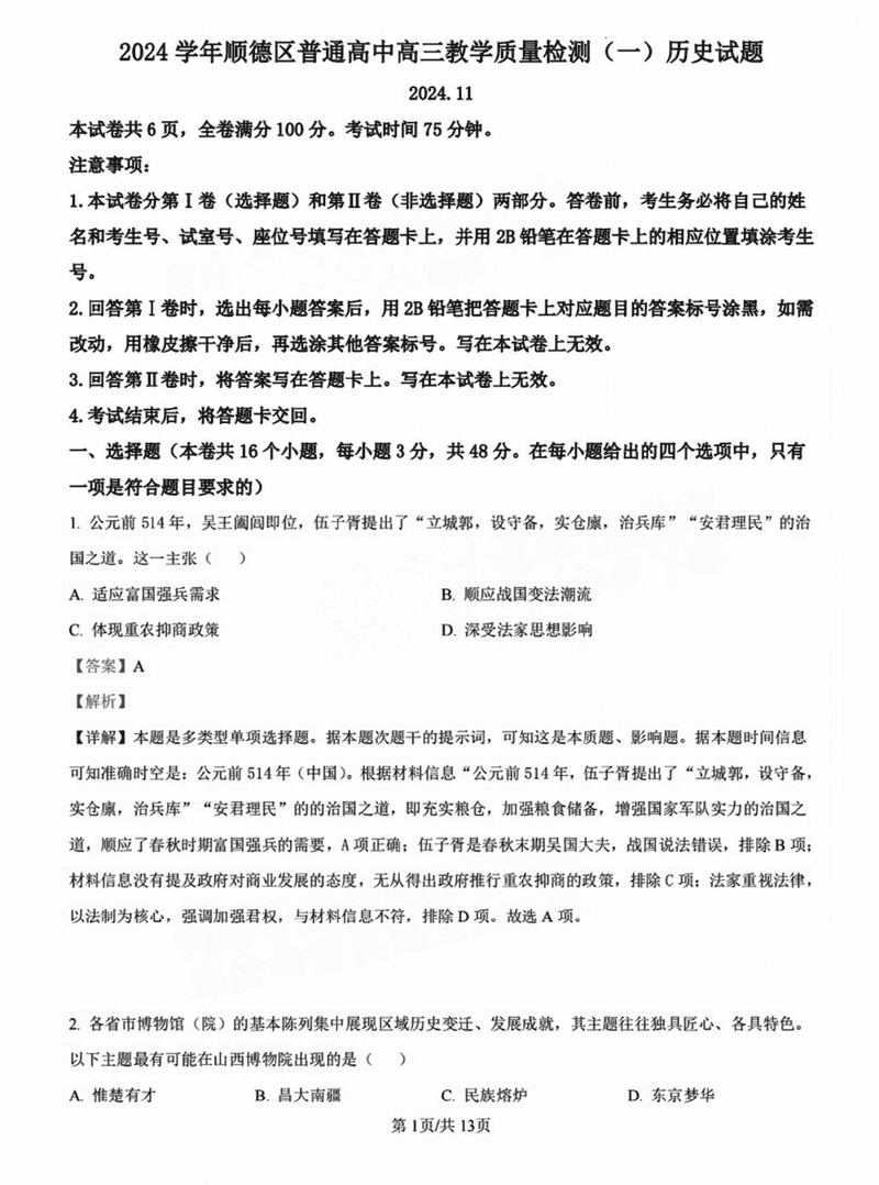 佛山顺德区2024学年高三教学质检(一)历史试题及答案