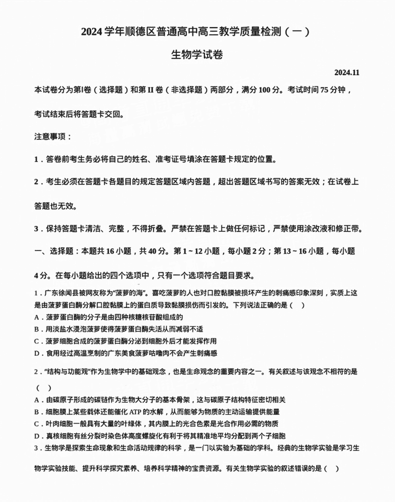 佛山顺德区2024学年高三教学质检(一)生物试题及答案