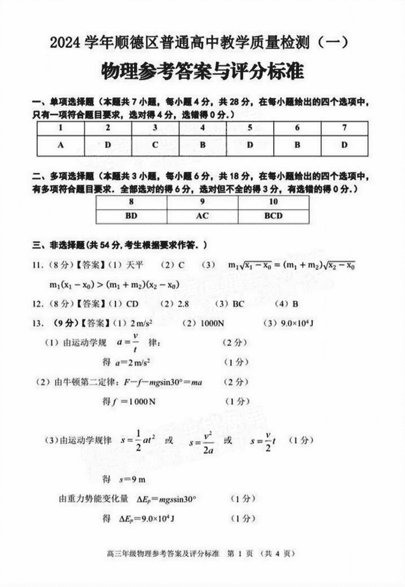 佛山顺德区2024学年高三教学质检(一)物理考试已于近日开考,为方便考生考后及时查看考试情况,查漏补缺、弥补不足,本文整理了试题答案解析相关信息!