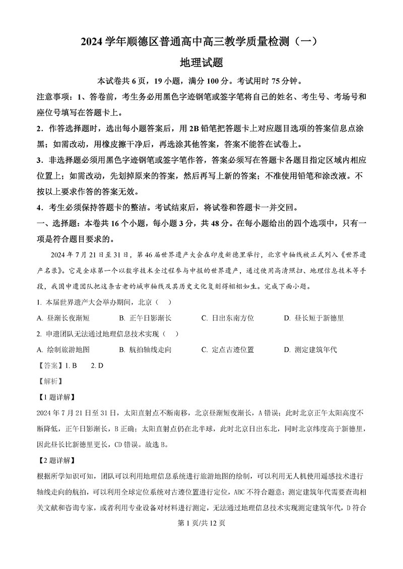 佛山顺德区2024学年高三教学质检(一)地理考试已于近日开考,为方便考生考后及时查看考试情况,查漏补缺、弥补不足,本文整理了试题答案解析相关信息!