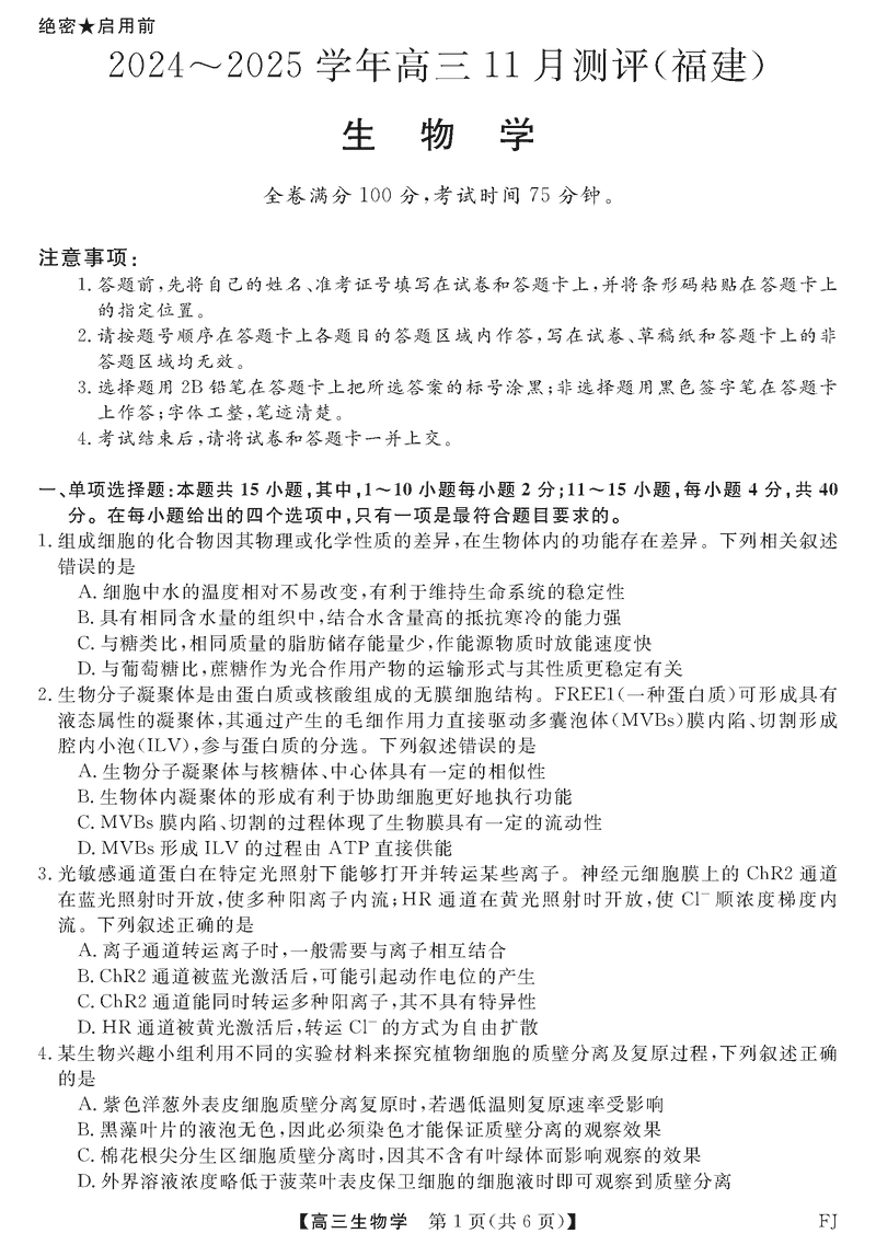 福建省2025届金科大联考高三11月测评生物试题及答案