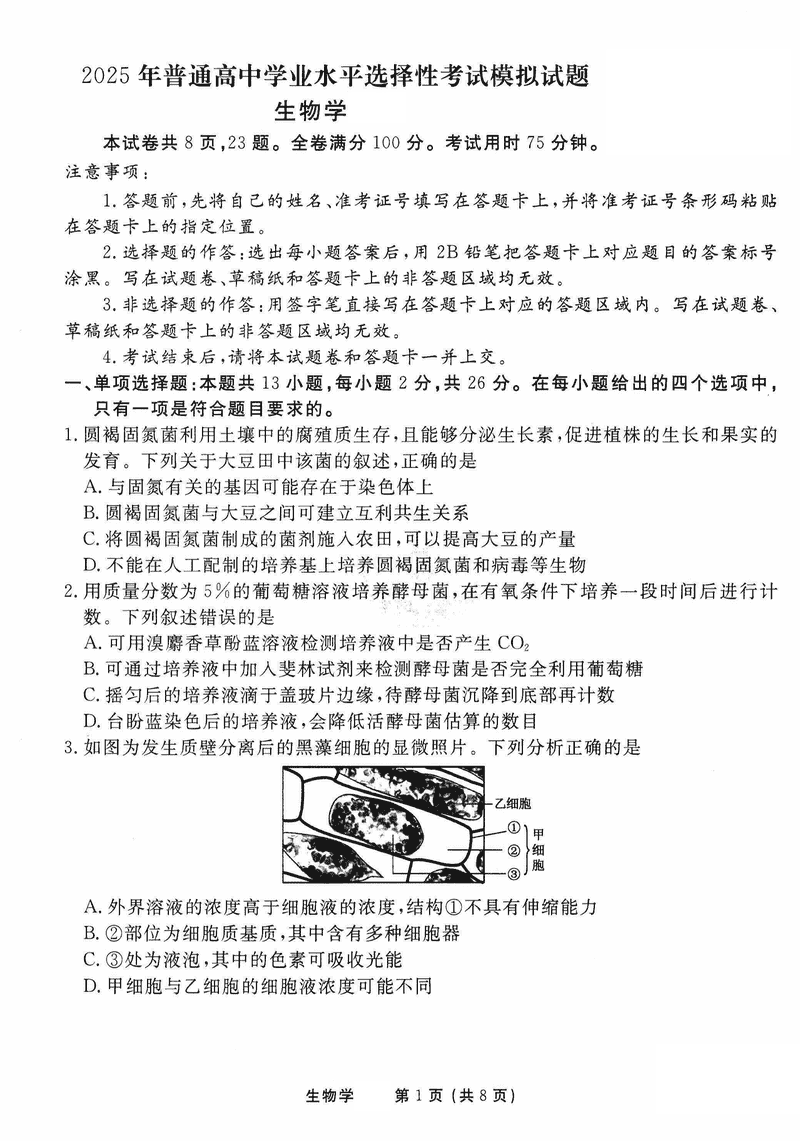 衡水金卷2025年高三学业选择考模拟试题(一)生物试题及答案