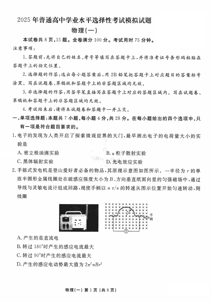 衡水金卷2025年高三学业选择考模拟试题(一)物理考试已于近日开考,为方便考生考后及时查看考试情况,查漏补缺、弥补不足,本文整理了试题答案解析相关信息!