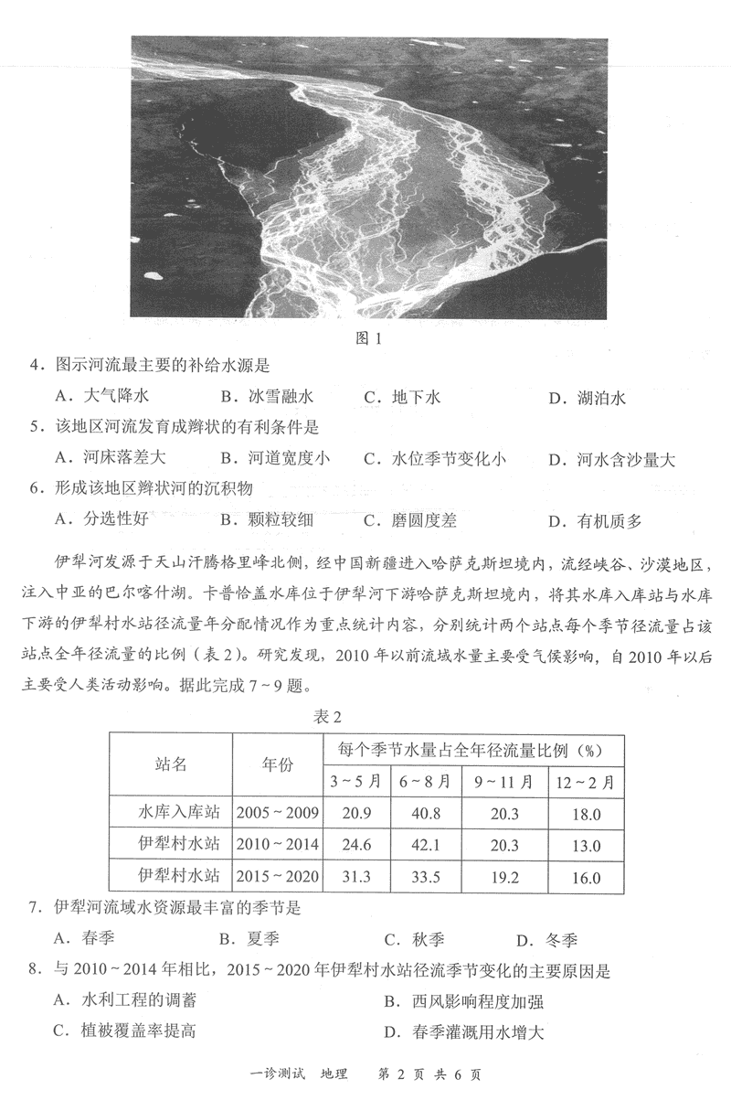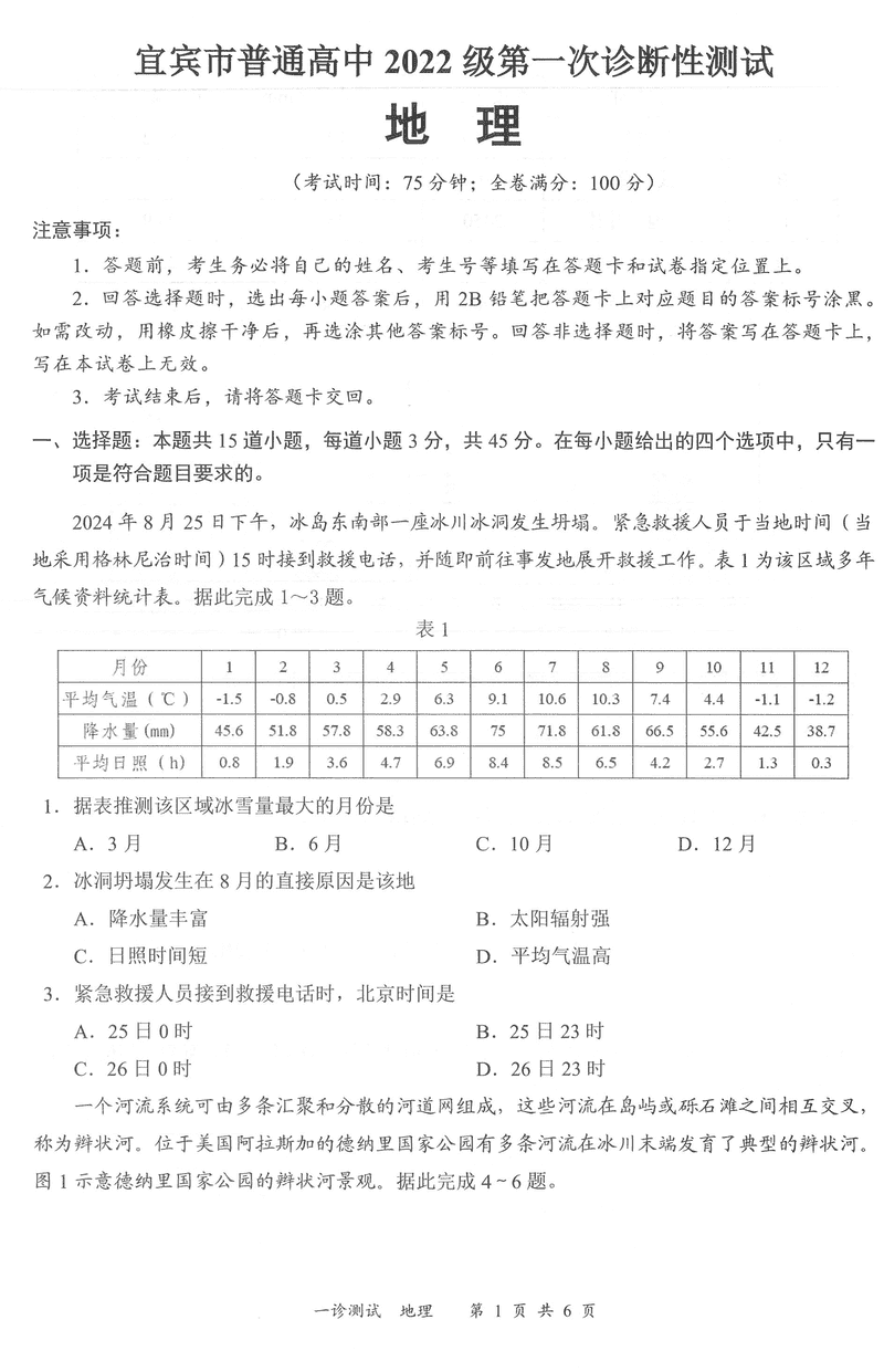 宜宾一诊2025届高三第一次诊断考地理试题及答案