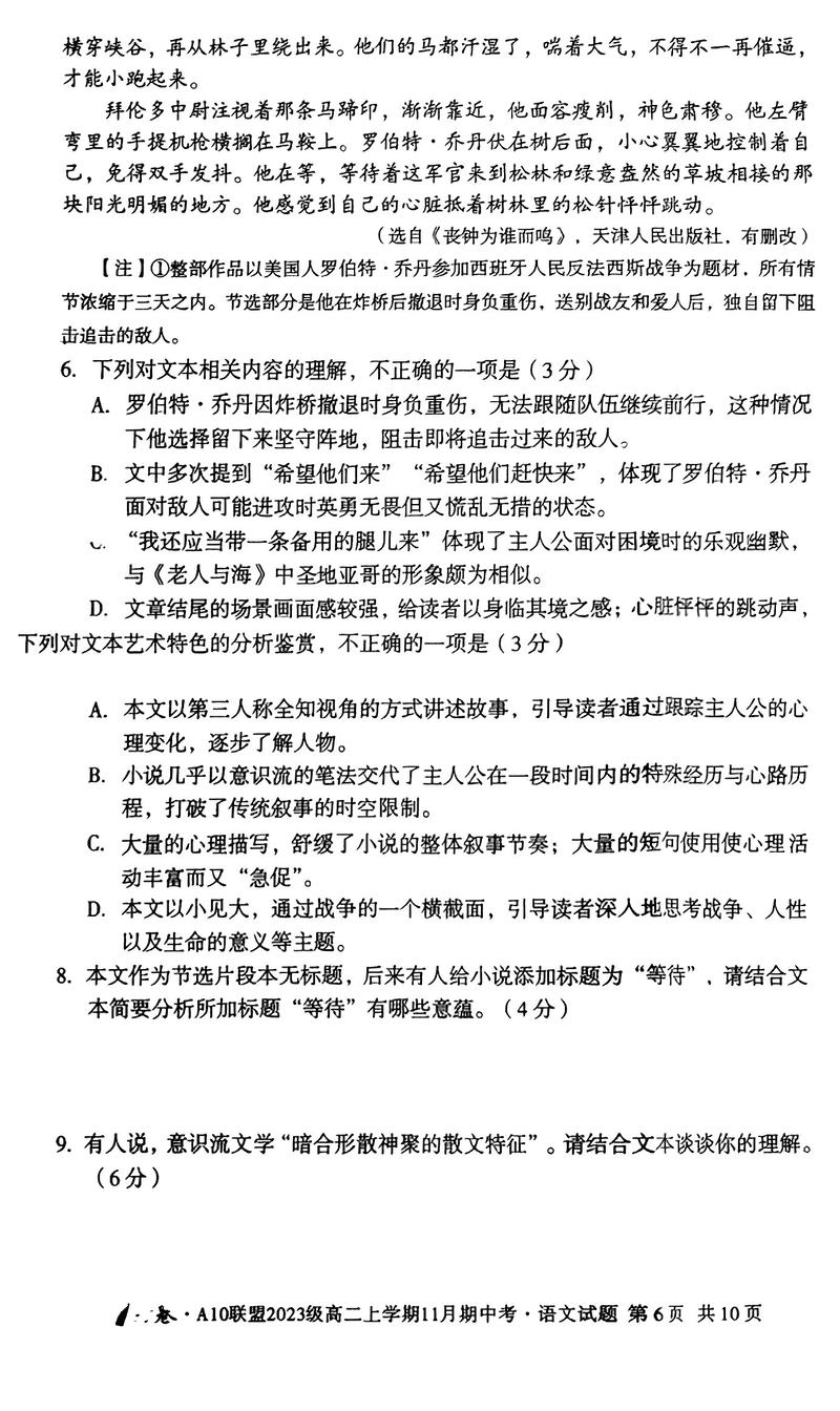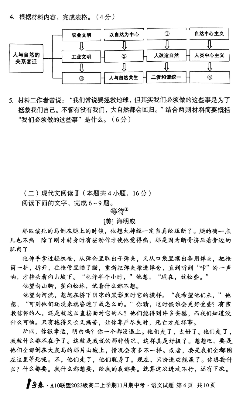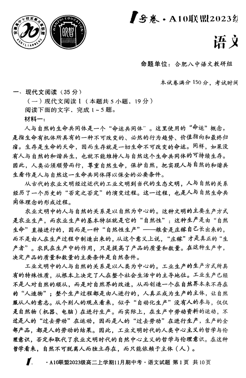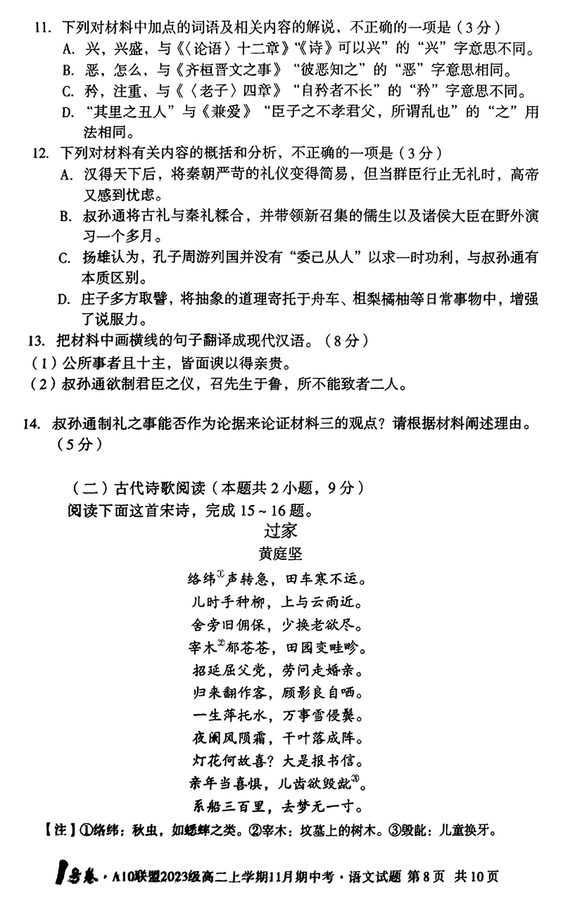 安徽A10联盟2024年11月高二期中语文试题及答案
