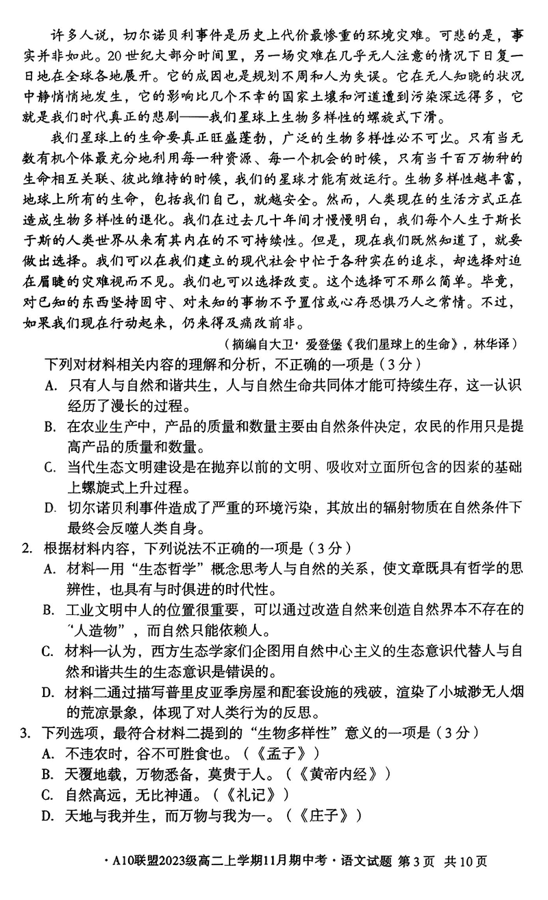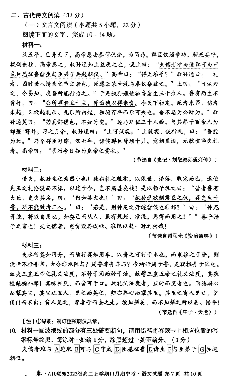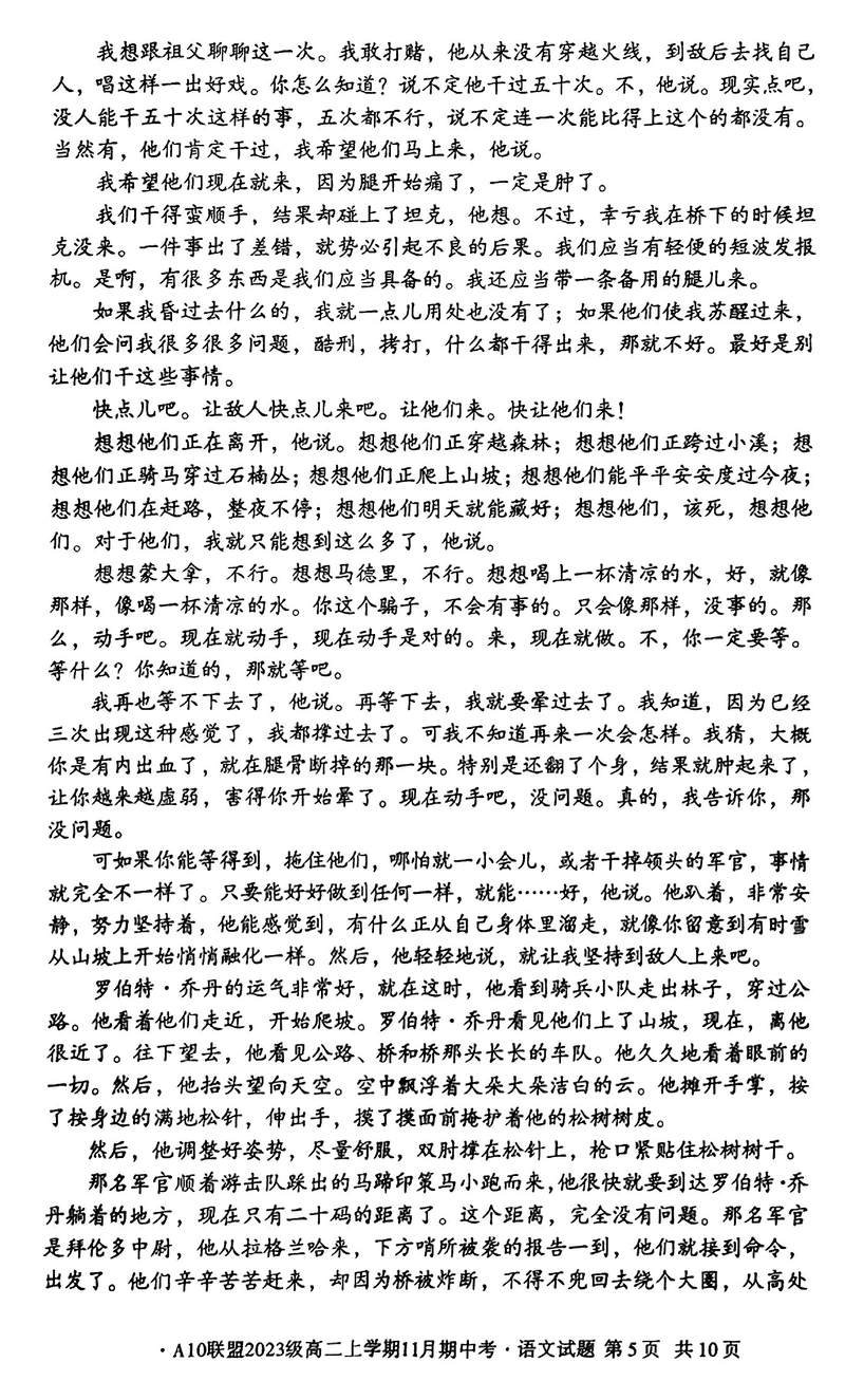 安徽A10联盟2024年11月高二期中语文试题及答案