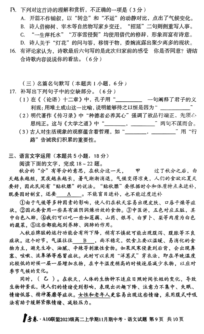 安徽A10联盟2024年11月高二期中语文考试已于近日开考,为方便考生考后及时查看考试情况,查漏补缺、弥补不足,本文整理了试题答案解析相关信息!