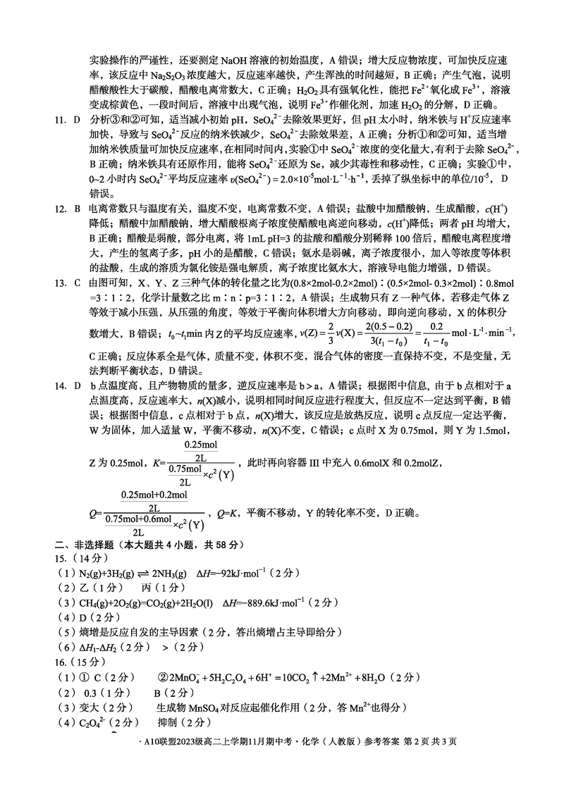 安徽A10联盟2024年11月高二期中化学试题及答案