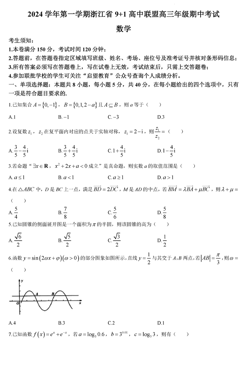 浙江省9+1高中联盟2025届高三期中数学试题及答案