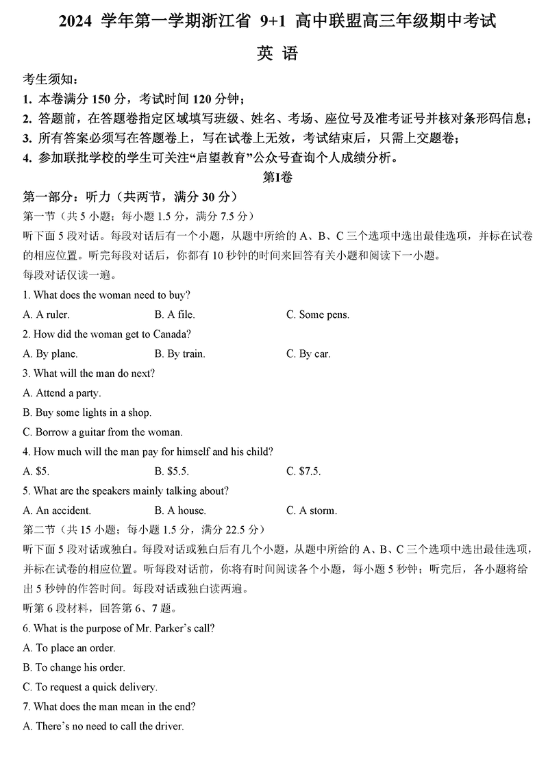 浙江省9+1高中联盟2025届高三期中英语考试已于近日开考,为方便考生考后及时查看考试情况,查漏补缺、弥补不足,本文整理了试题答案解析相关信息!