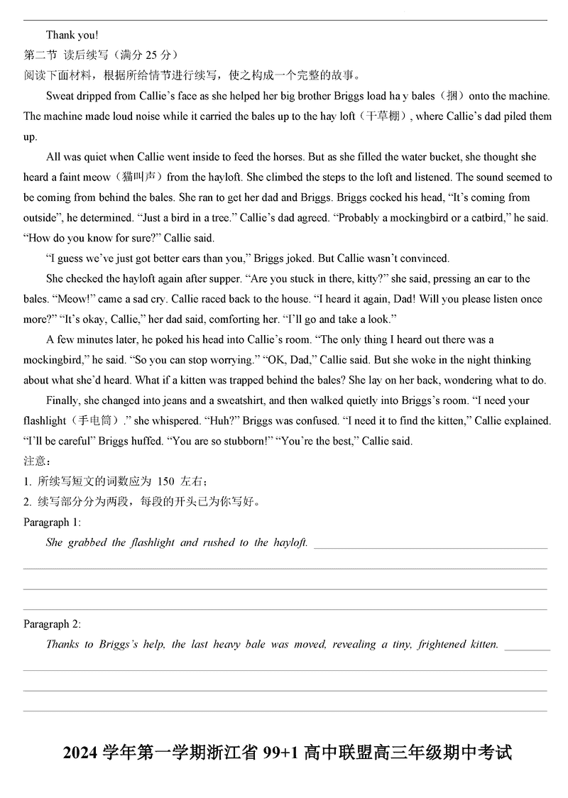 浙江省9+1高中联盟2025届高三期中英语试题及答案