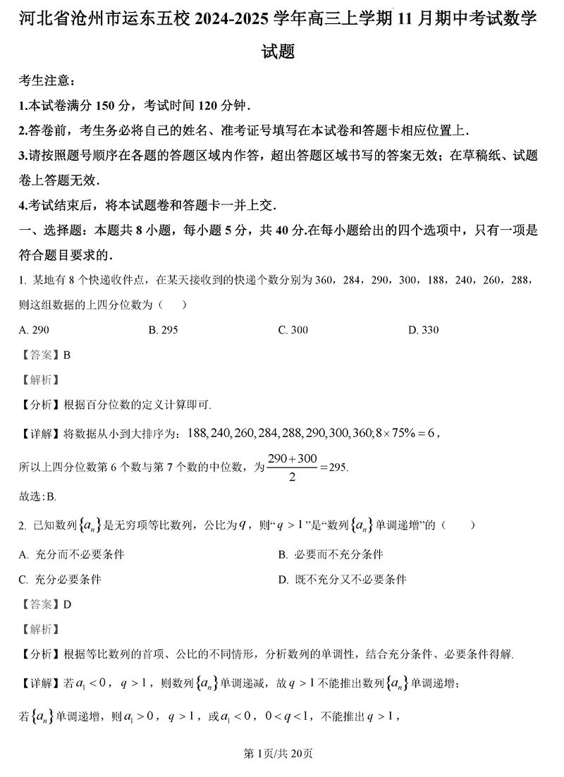 沧州市运东五校2024-2025学年高三上学期11月期中数学考试已于近日开考,为方便考生考后及时查看考试情况,查漏补缺、弥补不足,本文整理了试题答案解析相关信息!
