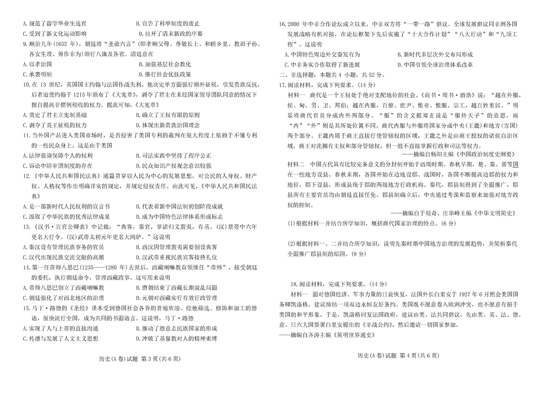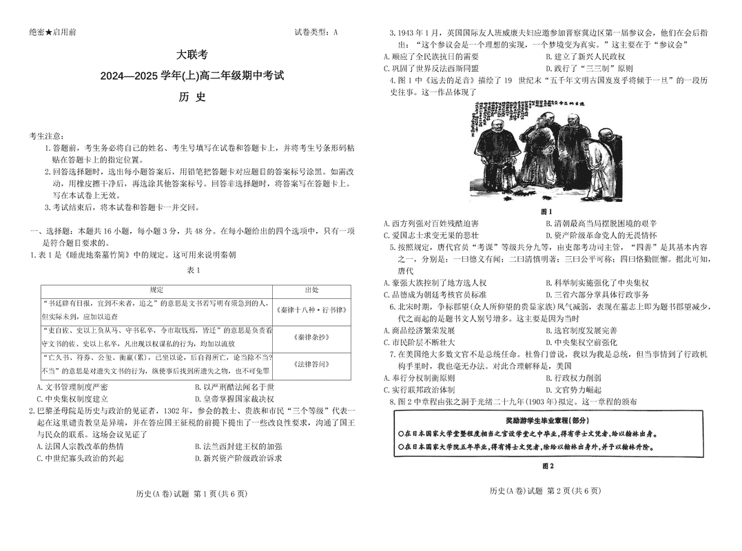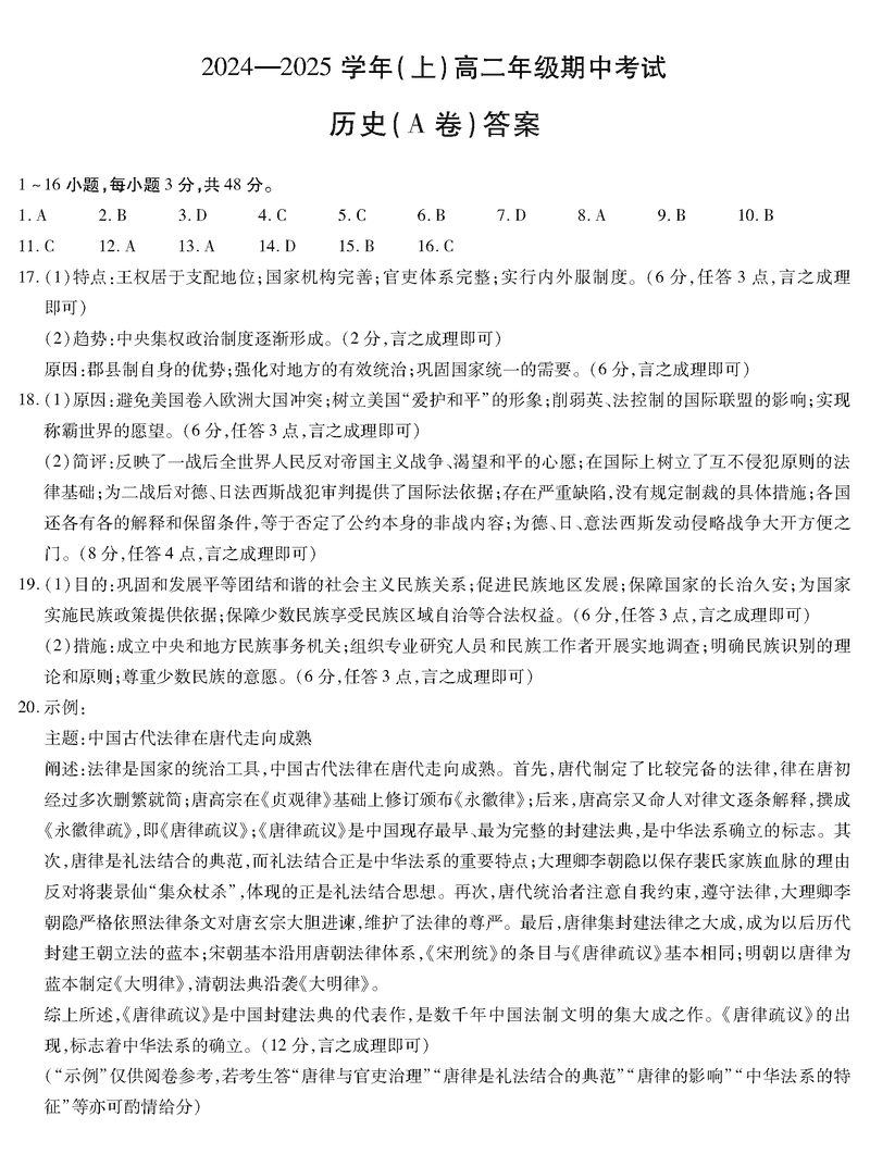河南天一大联考2024年11月高二上学期期中历史试题及答案