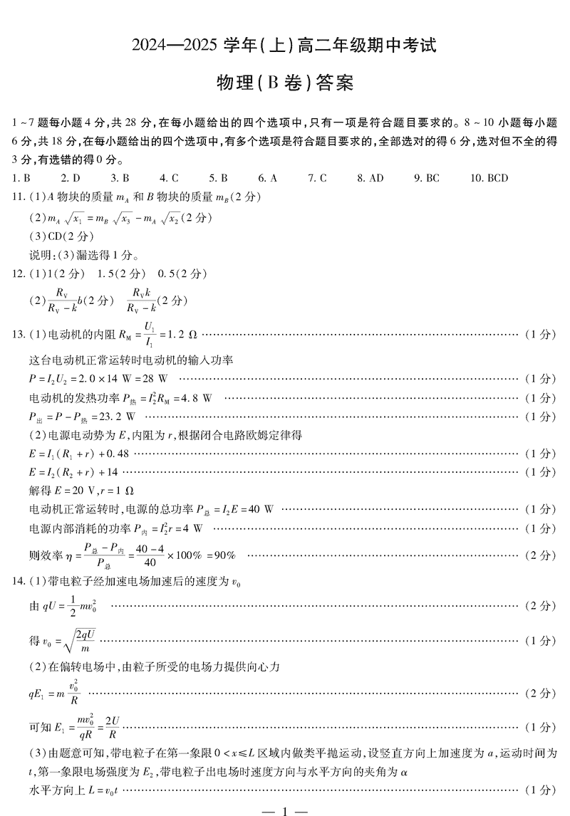 河南天一大联考2024年11月高二上学期期中物理试题及答案