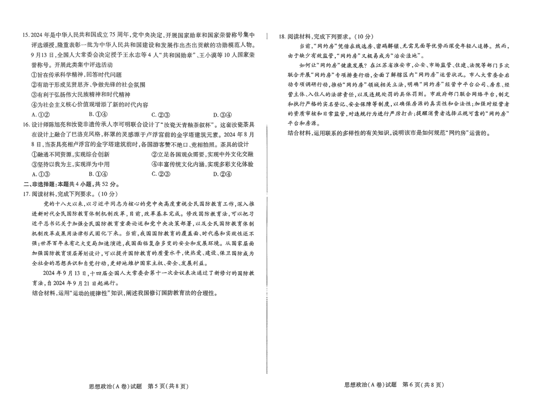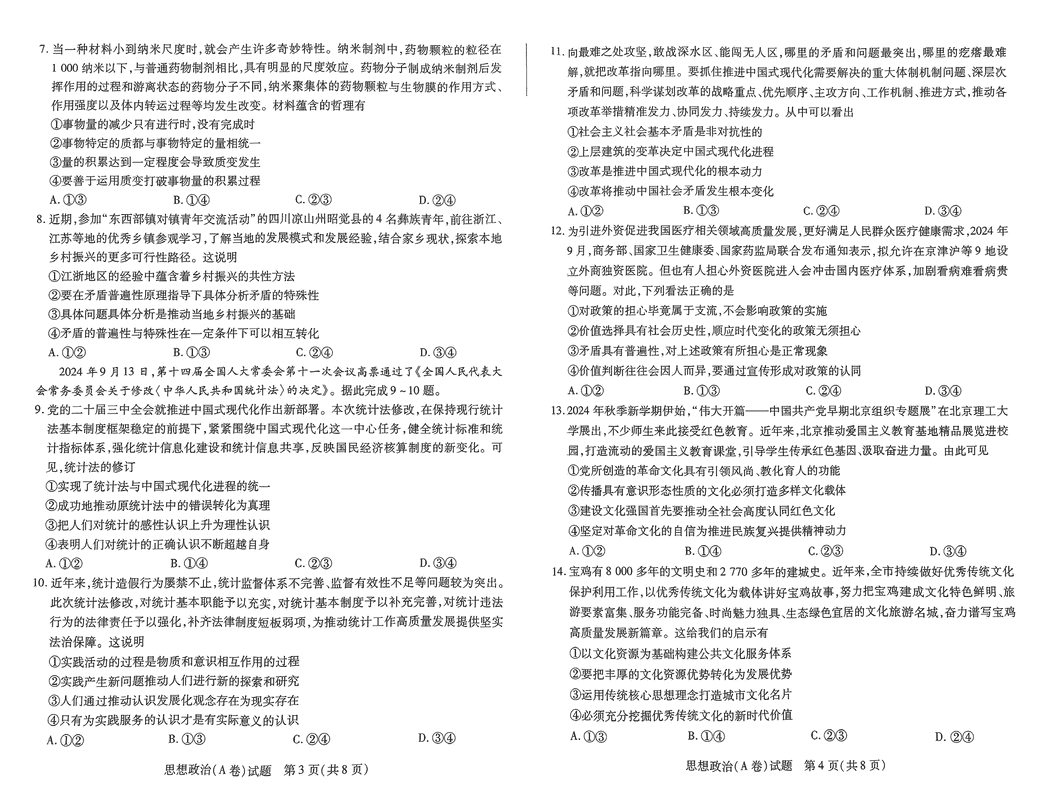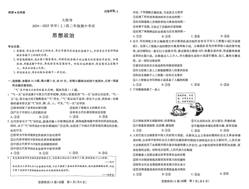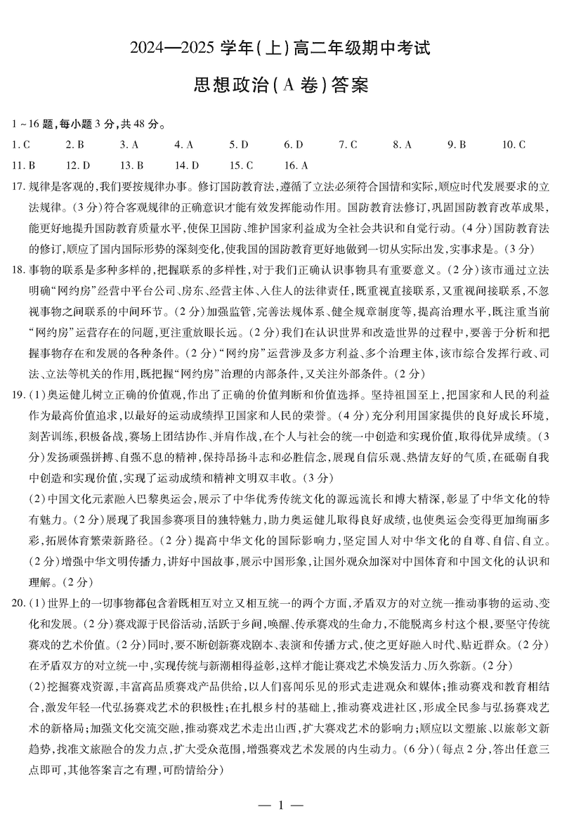 河南天一大联考2024年11月高二上学期期中政治试题及答案