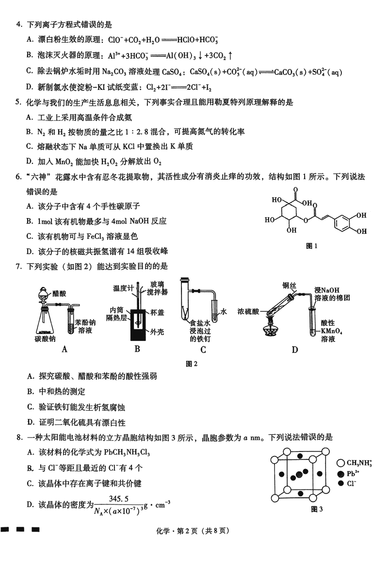 重庆八中2025届高三上学期适应性月考(三)化学试题及答案