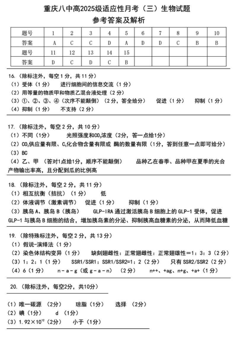 重庆八中2025届高三上学期适应性月考(三)生物考试已于近日开考,为方便考生考后及时查看考试情况,查漏补缺、弥补不足,本文整理了试题答案解析相关信息!