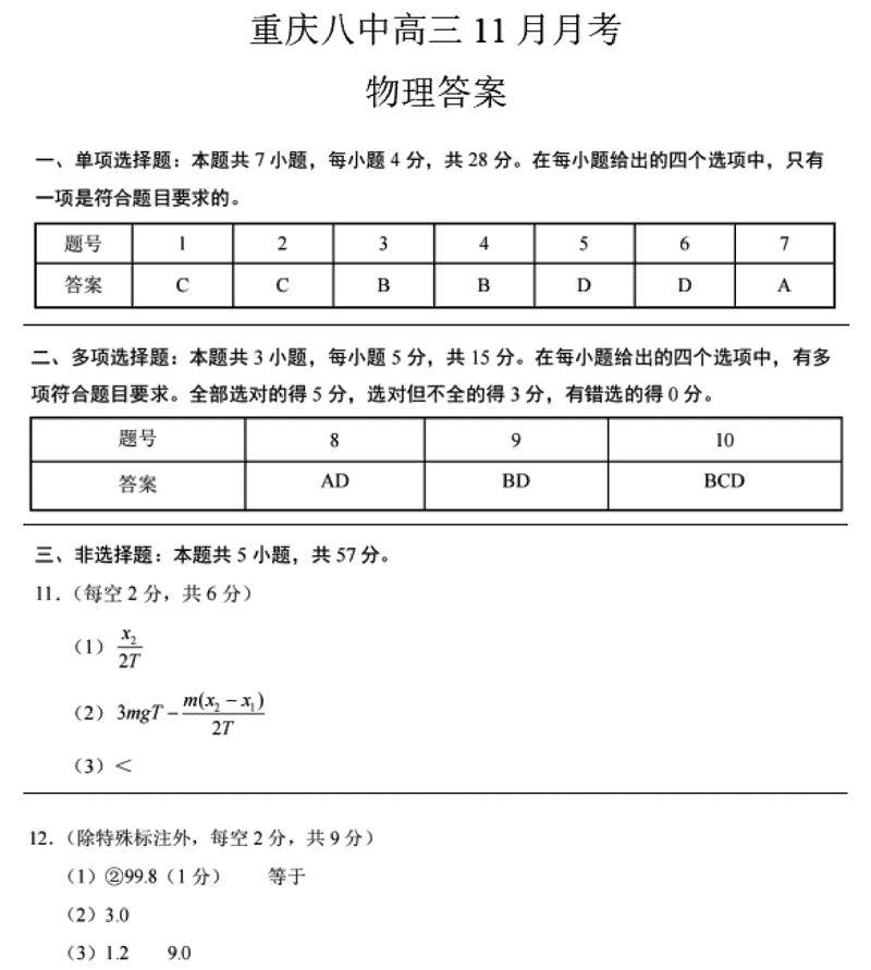 重庆八中2025届高三上学期适应性月考(三)物理考试已于近日开考,为方便考生考后及时查看考试情况,查漏补缺、弥补不足,本文整理了试题答案解析相关信息!