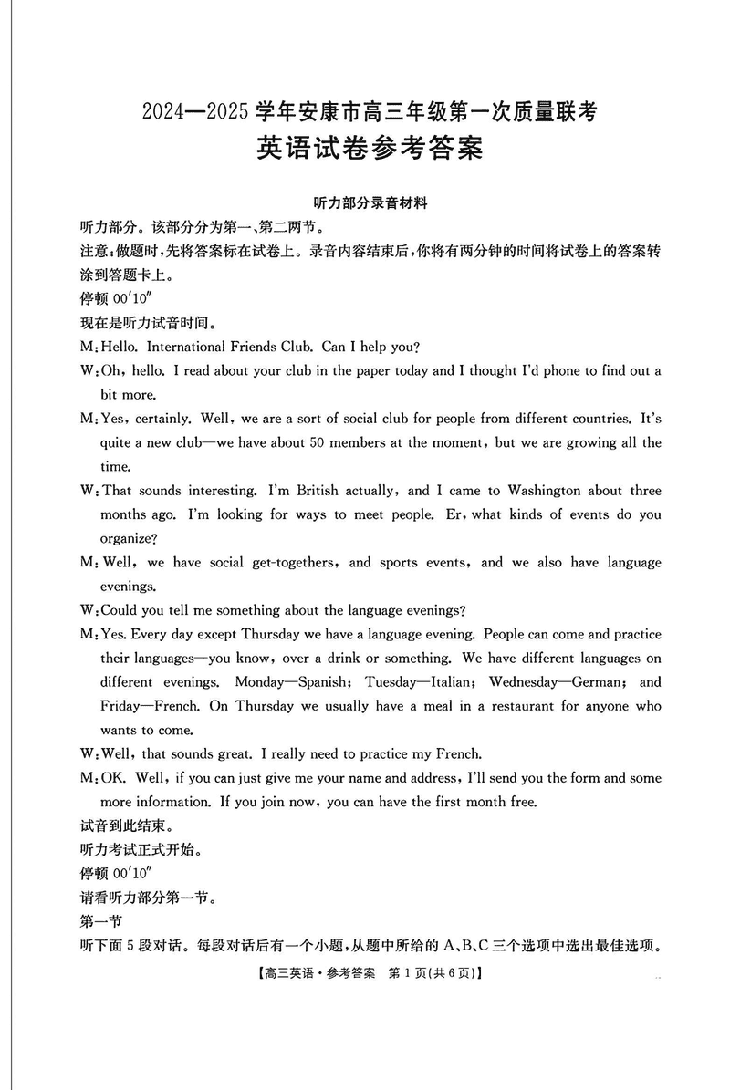 陕西安康2025届高三上学期第一次质量联考英语考试已于近日开考,为方便考生考后及时查看考试情况,查漏补缺、弥补不足,本文整理了试题答案解析相关信息!