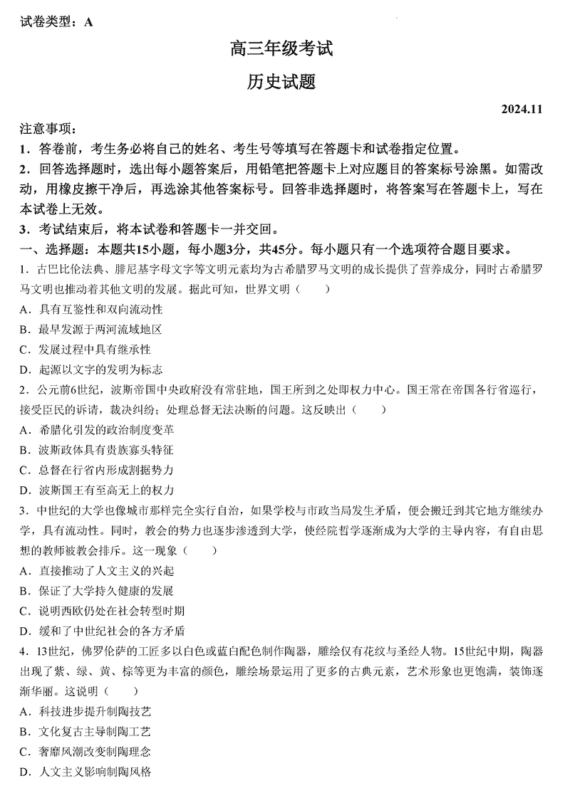 山东泰安2025届高三上学期11月期中历史试题及答案 时间:2024-11-24 23:28 山东 文综试题 山东泰安2025届高三上学期11月期中历史考试已于近日开考,为方便考生考后及时查看考试情况,查漏补缺、弥补不足,本文整理了试题答案解析相关信息! 汇总:山东泰安2025届高三上学期11月期中试题及答案汇总 历史试题及答案解析