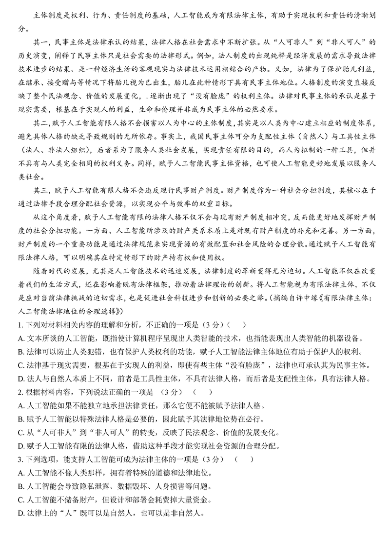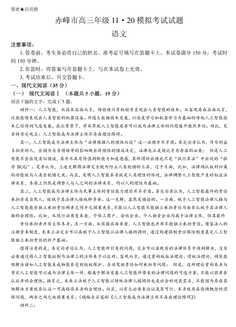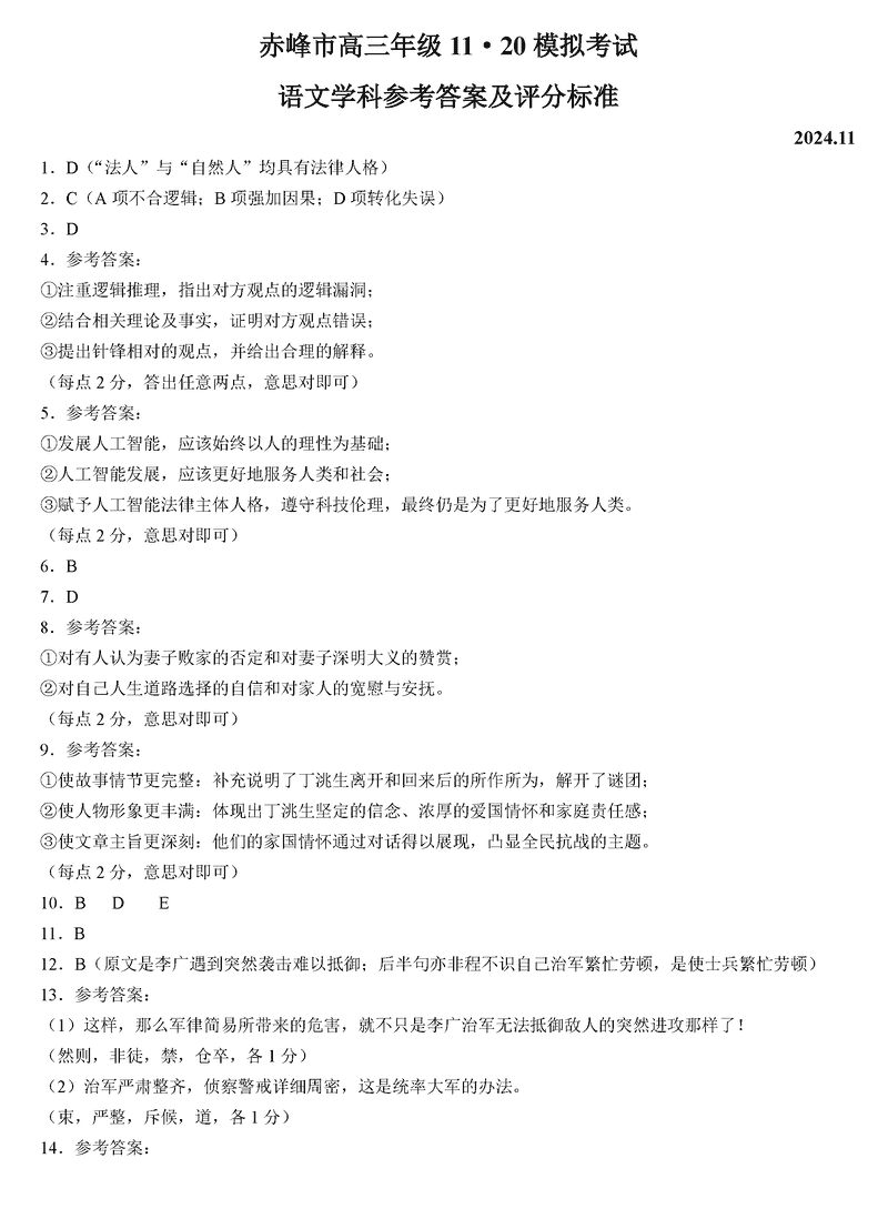 内蒙古赤峰市2024年11.20高三模拟语文试题及答案