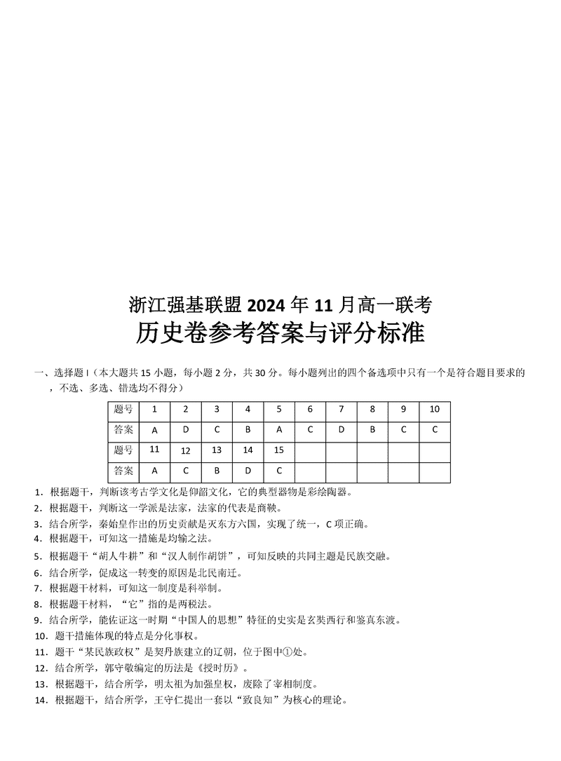 浙江强基联盟2024年11月高一上学期联考历史试题及答案 时间:2024-11-25 16:31 浙江 高中历史 浙江省强基联盟2024-2025学年高一上学期11月联考历史考试已于近日开考,为方便考生考后及时查看考试情况,查漏补缺、弥补不足,本文整理了试题答案解析相关信息! 历史试题及答案解析