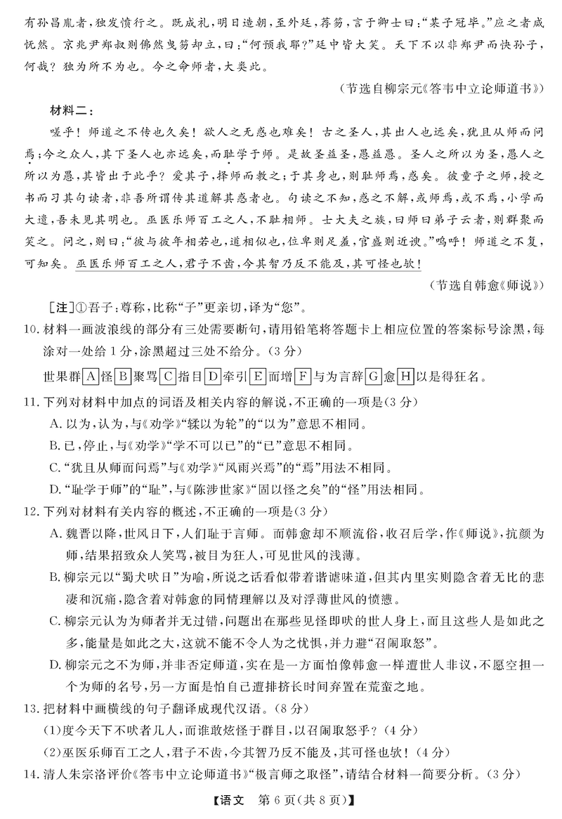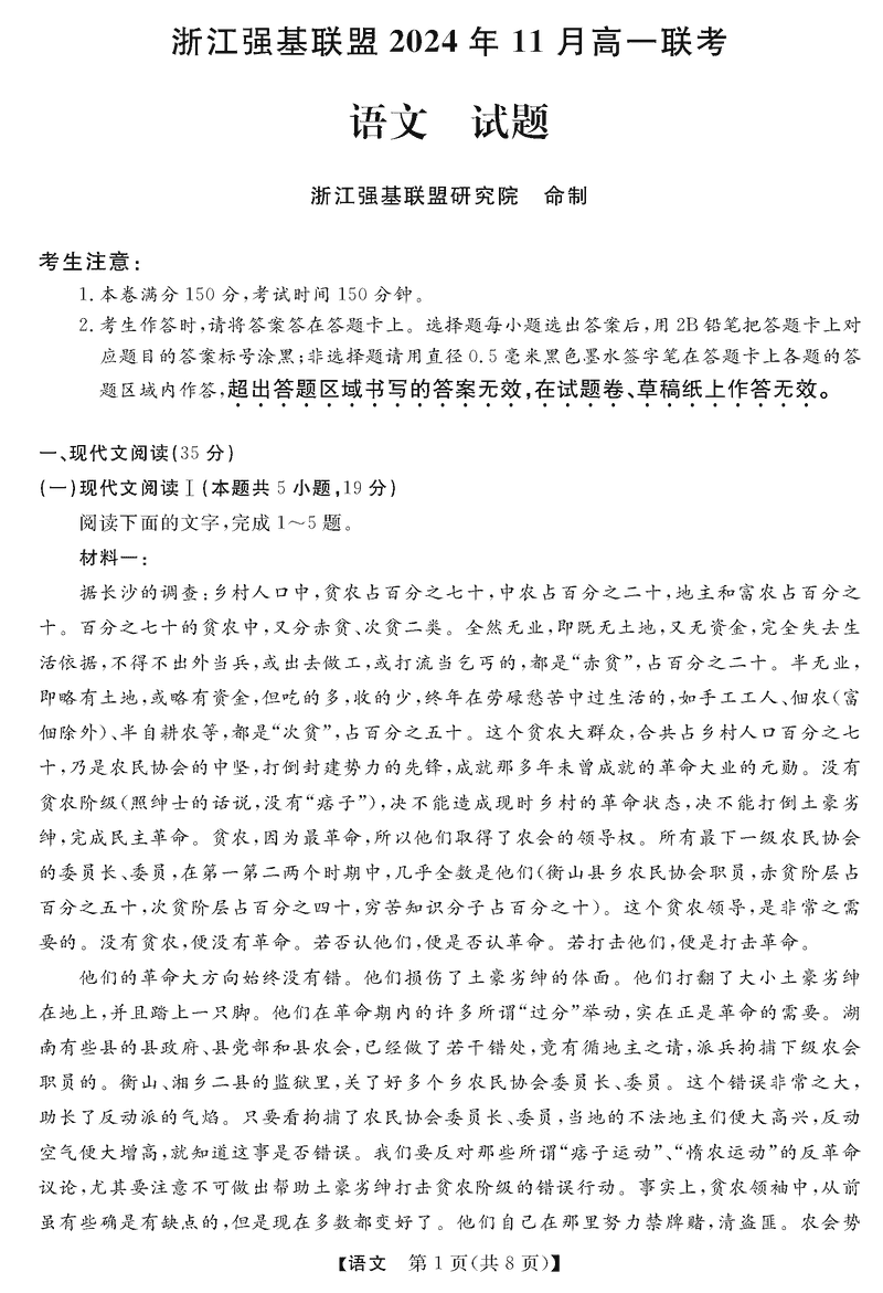浙江强基联盟2024年11月高一上学期联考语文试题及答案