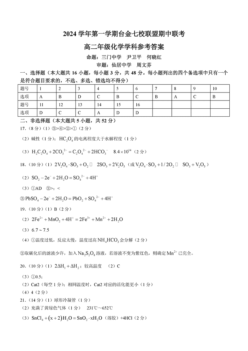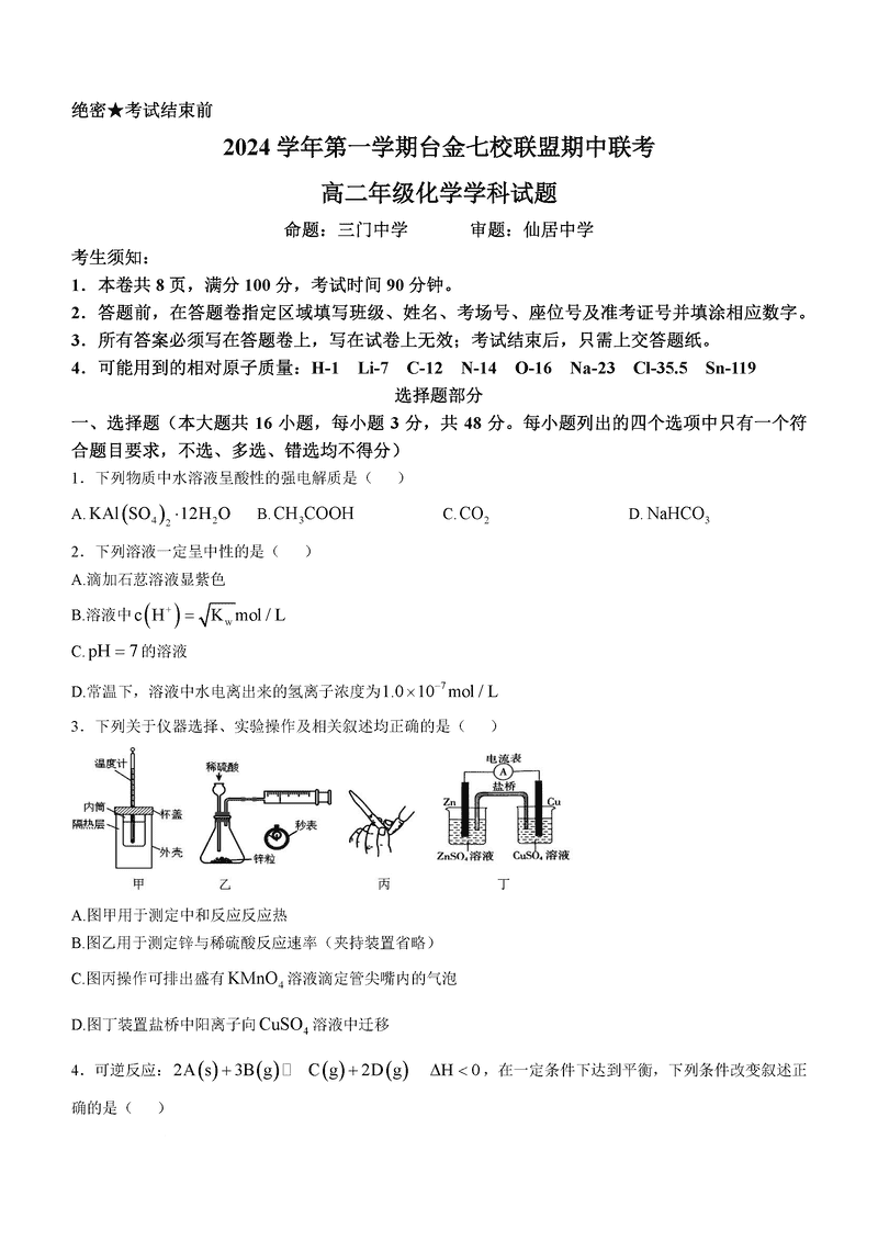 浙江台金七校联盟2024年高二11月期中联考化学试题及答案 时间:2024-11-25 17:20 浙江 高中化学 浙江台金七校联盟2024年高二11月期中联考化学考试已于近日开考,为方便考生考后及时查看考试情况,查漏补缺、弥补不足,本文整理了试题答案解析相关信息! 化学试题及答案解析
