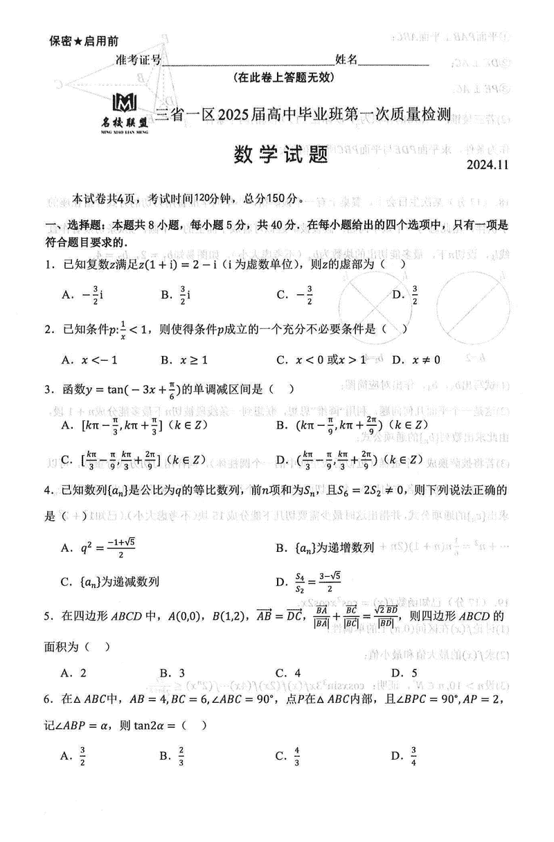 2025届东北三省一区名校联盟高三11月第一次质检数学考试已于近日开考,为方便考生考后及时查看考试情况,查漏补缺、弥补不足,本文整理了试题答案解析相关信息!