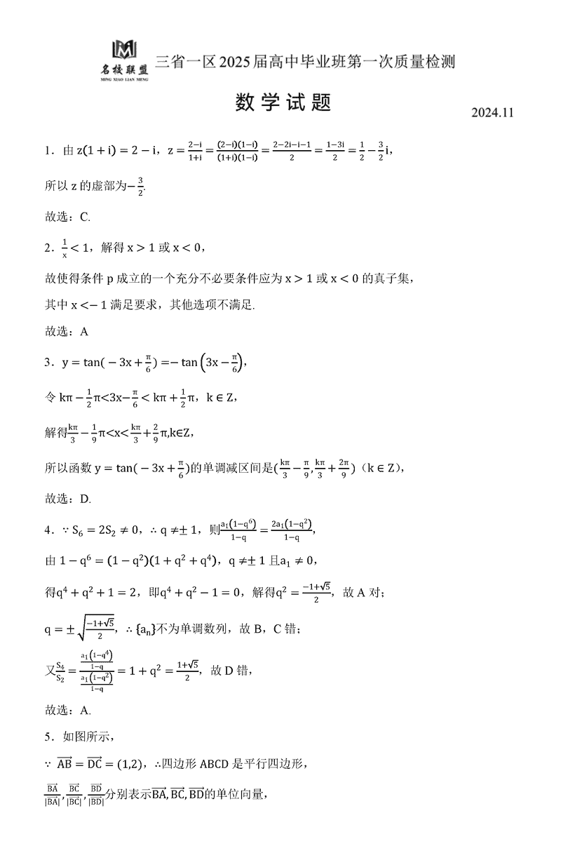 2025届东北三省一区名校联盟高三11月第一次质检数学试题及答案