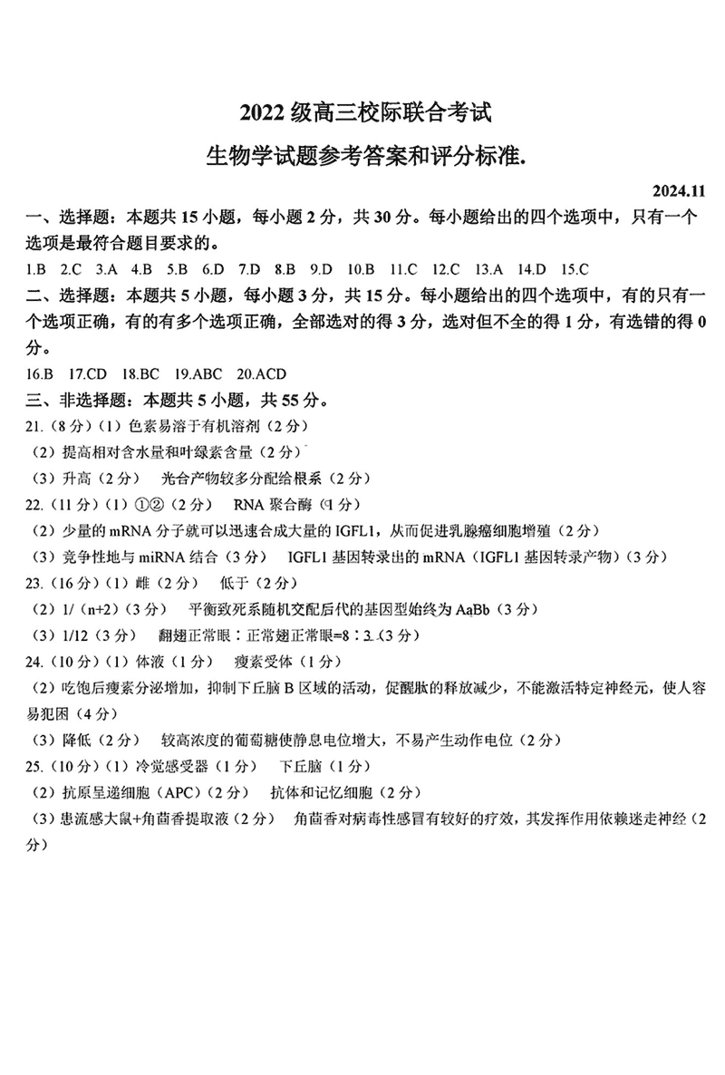 山东日照2025届高三上学期11月期中校际联考生物考试已于近日开考,为方便考生考后及时查看考试情况,查漏补缺、弥补不足,本文整理了试题答案解析相关信息!