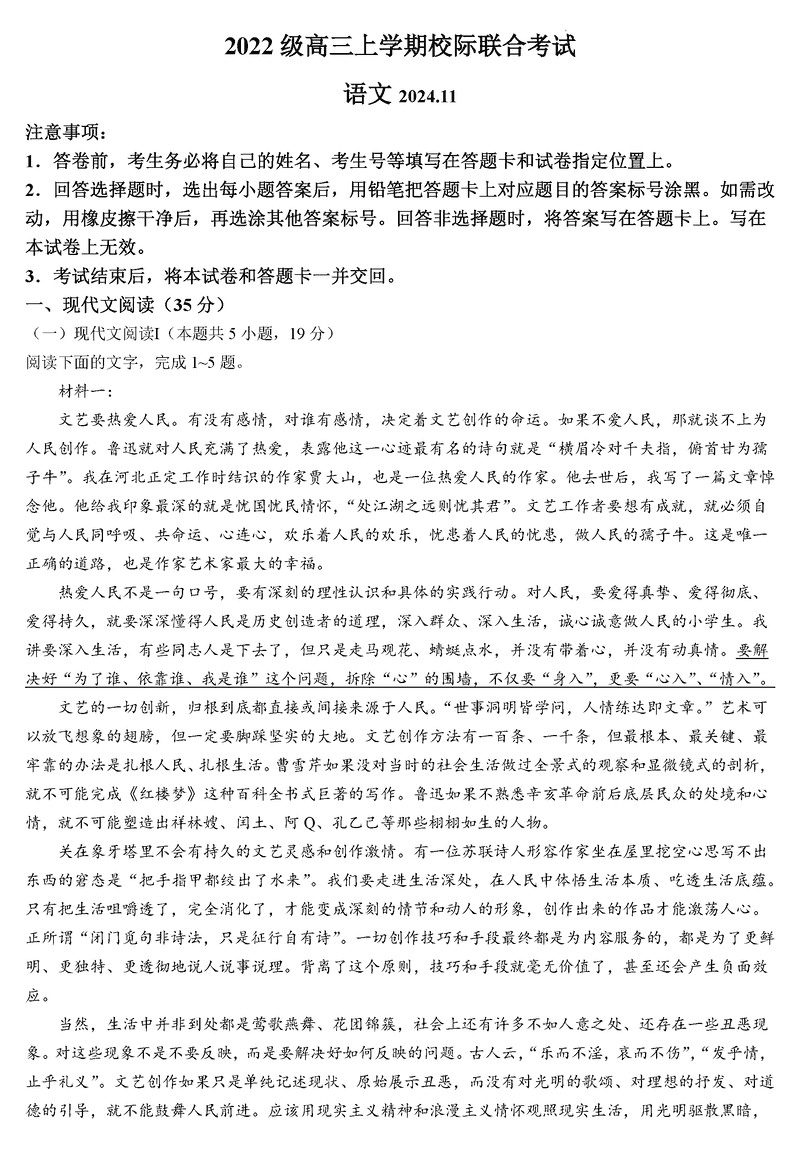 山东日照2025届高三上学期11月期中校际联考语文试题及答案