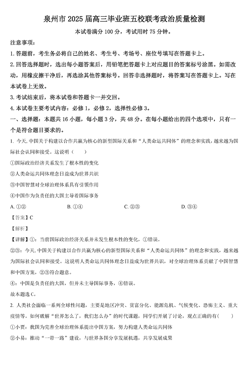 泉州五校2025届高三上学期11月期中联考政治试题及答案