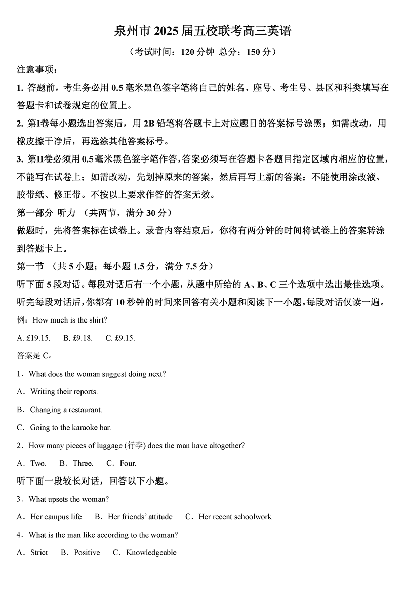 泉州五校2025届高三上学期11月期中联考英语考试已于近日开考,为方便考生考后及时查看考试情况,查漏补缺、弥补不足,本文整理了试题答案解析相关信息!