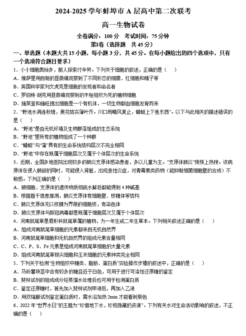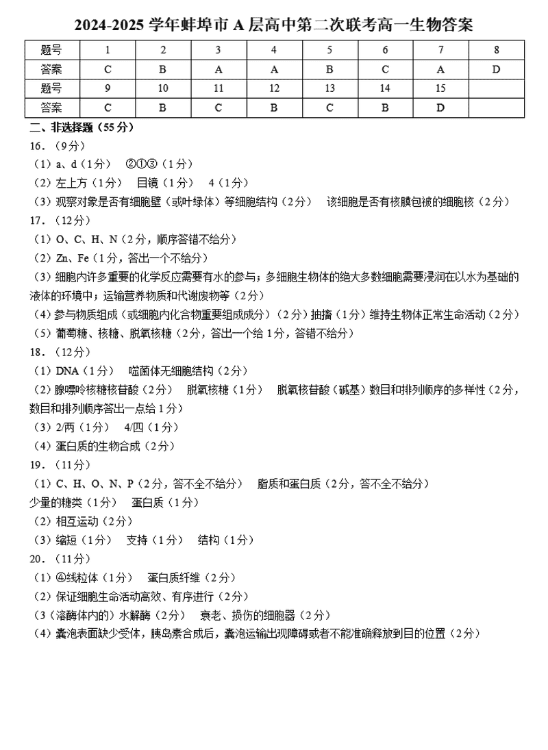 蚌埠市A层高中2024年11月高一第二次联考生物试题及答案 时间:2024-11-26 21:42 安徽 高中生物 安徽省蚌埠市A层高中2024-2025学年高一上学期11月期中生物考试已于近日开考,为方便考生考后及时查看考试情况,查漏补缺、弥补不足,本文整理了试题答案解析相关信息! 生物试题及答案解析
