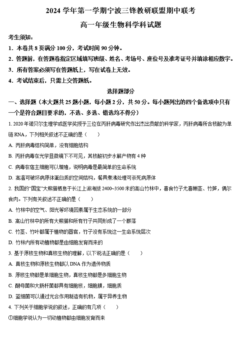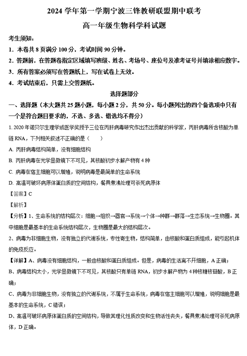 宁波三锋联盟2024年11月高一上学期期中生物试题及答案 时间:2024-11-26 22:17 浙江 高中生物 宁波市三锋联盟2024-2025学年高一上学期11月期中生物考试已于近日开考,为方便考生考后及时查看考试情况,查漏补缺、弥补不足,本文整理了试题答案解析相关信息! 生物试题及答案解析