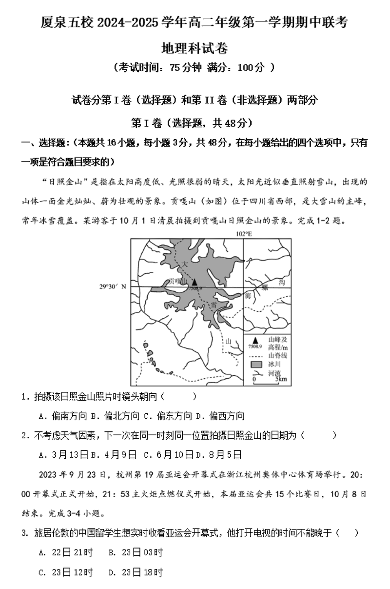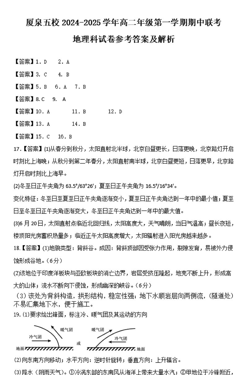 厦泉五校2024年11月高二上学期期中联考地理试题及答案 时间:2024-11-26 22:29 福建 高中地理 厦门市、泉州市五校2024-2025学年高二上学期11月期中联考地理考试已于近日开考,为方便考生考后及时查看考试情况,查漏补缺、弥补不足,本文整理了试题答案解析相关信息! 地理试题及答案解析