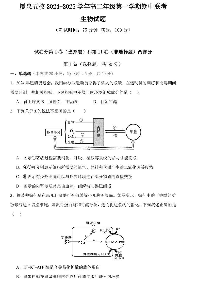 厦泉五校2024年11月高二上学期期中联考生物试题及答案 时间:2024-11-26 22:34 福建 高中生物 厦门市、泉州市五校2024-2025学年高二上学期11月期中联考生物考试已于近日开考,为方便考生考后及时查看考试情况,查漏补缺、弥补不足,本文整理了试题答案解析相关信息! 生物试题及答案解析