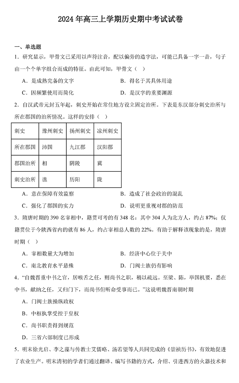 湖南岳阳临湘2025届高三上学期11月期中历史考试已于近日开考,为方便考生考后及时查看考试情况,查漏补缺、弥补不足,本文整理了试题答案解析相关信息!
