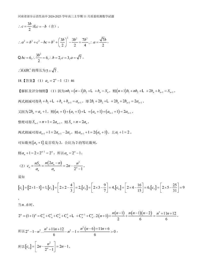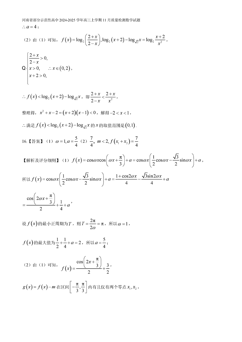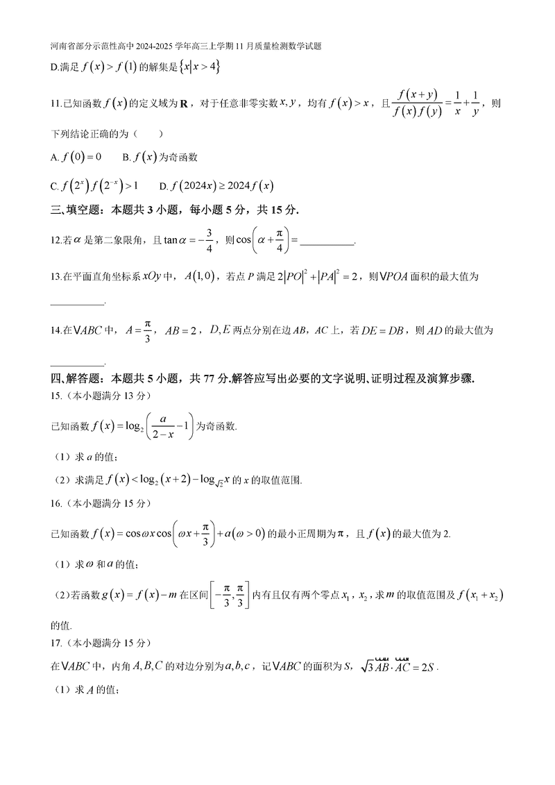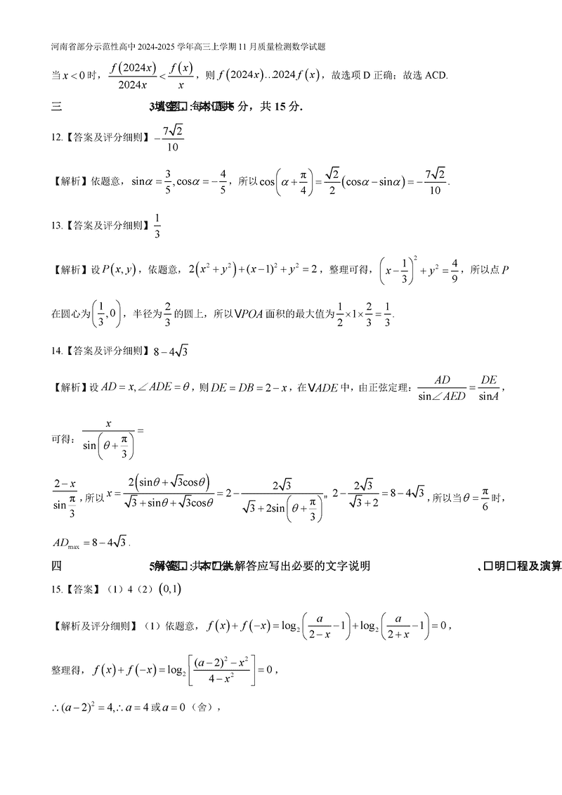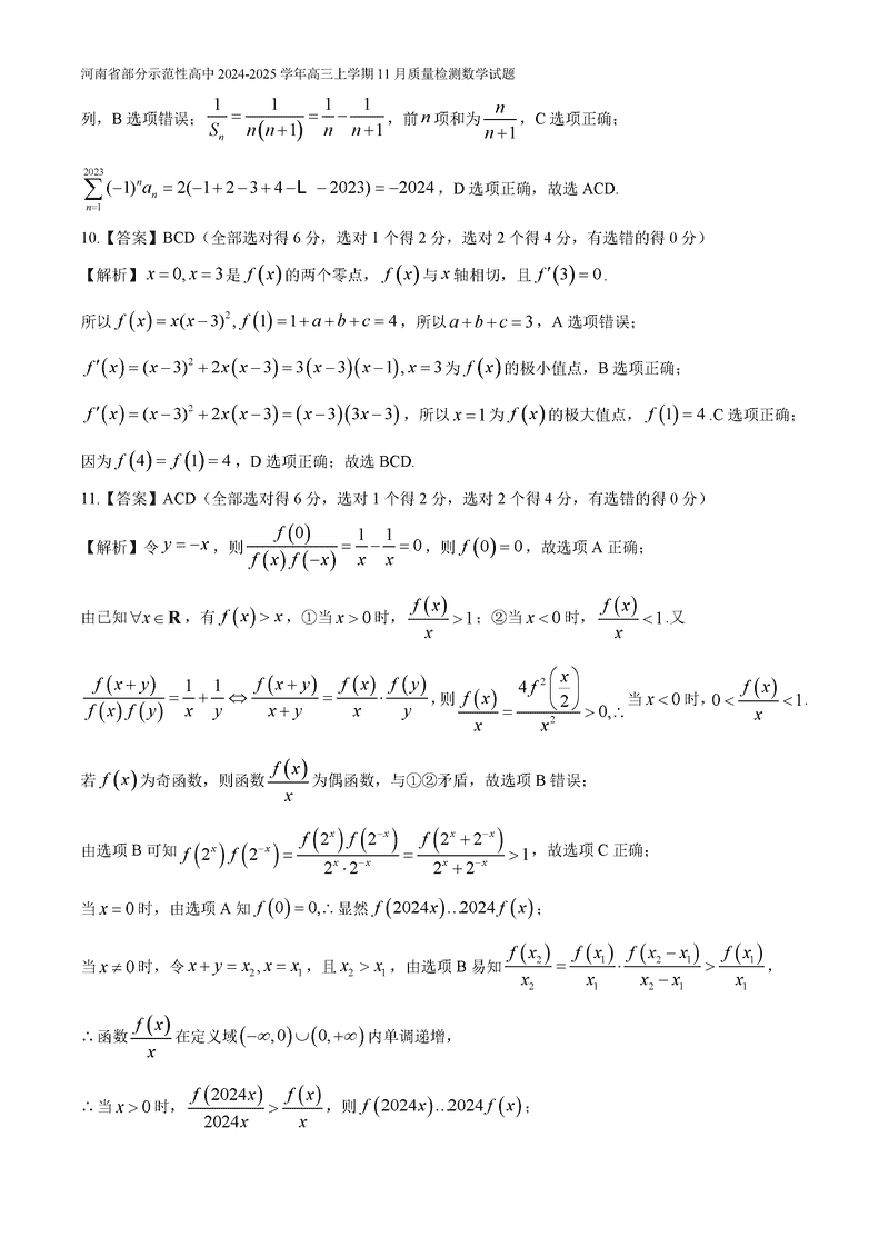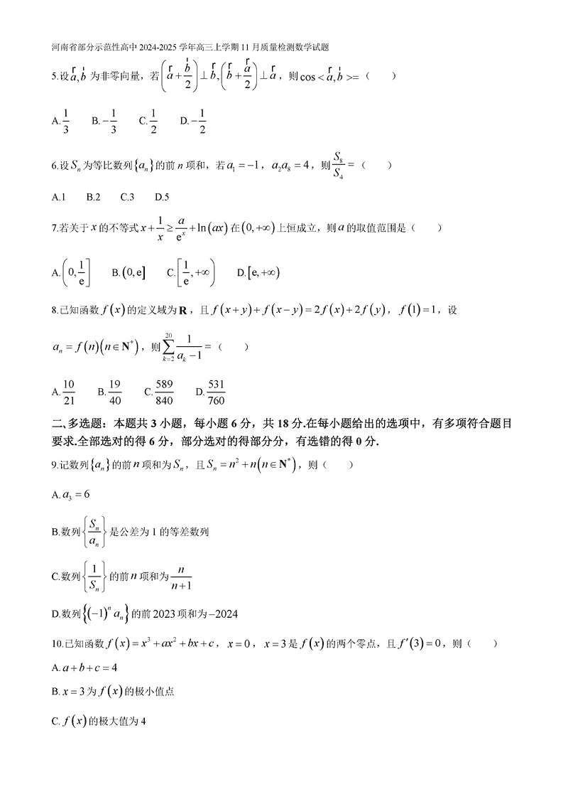 河南部分示范性高中2024年11月高三上期中数学试题及答案