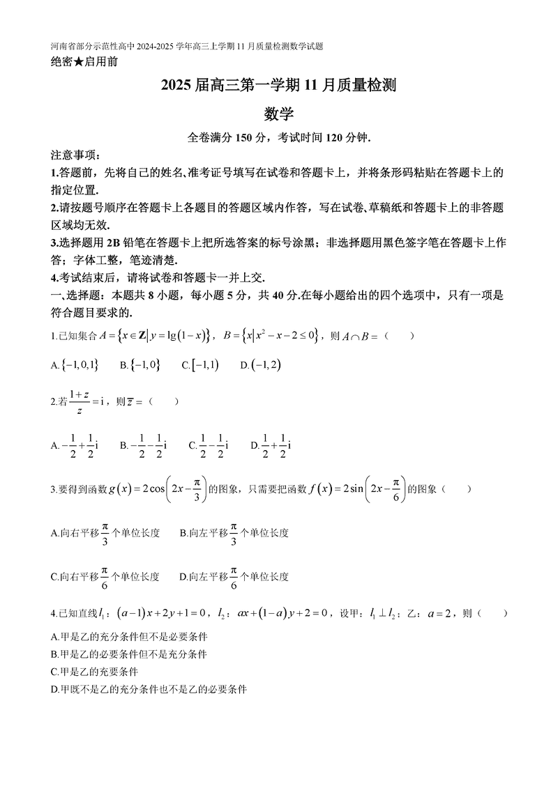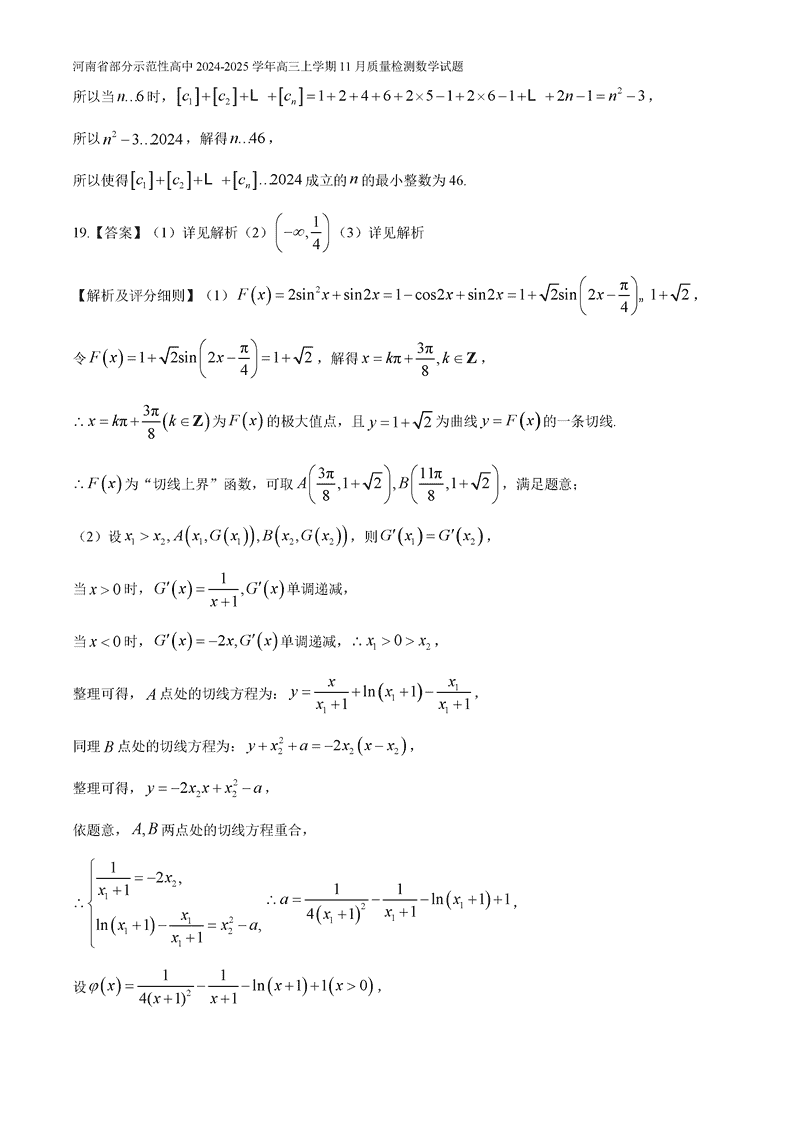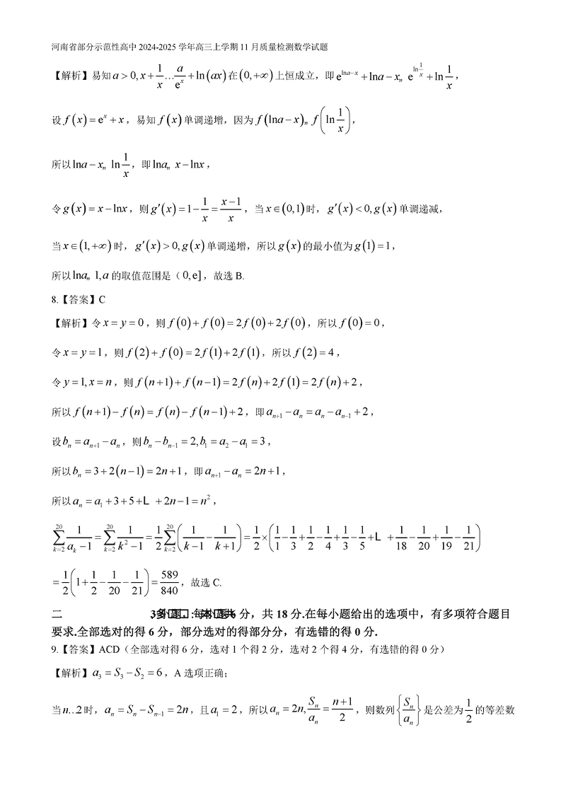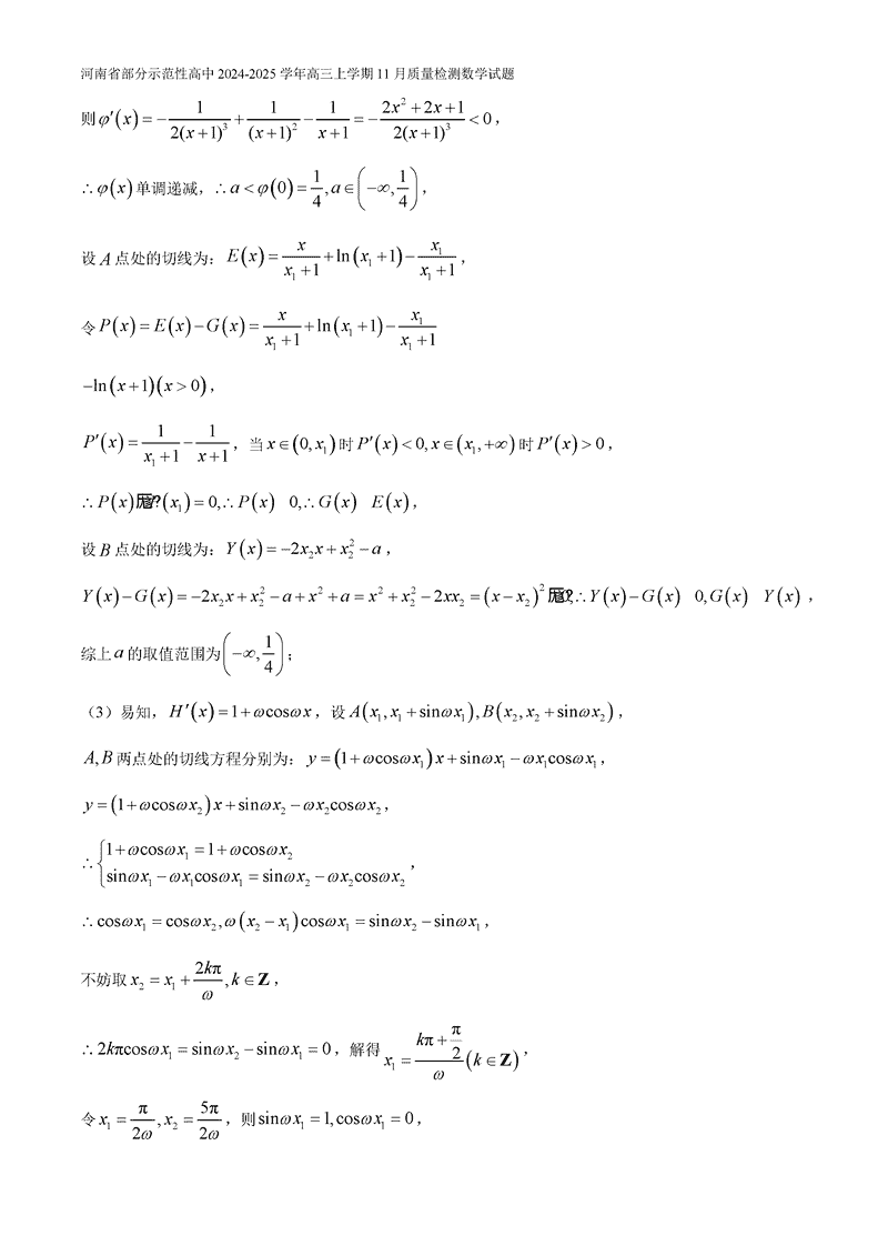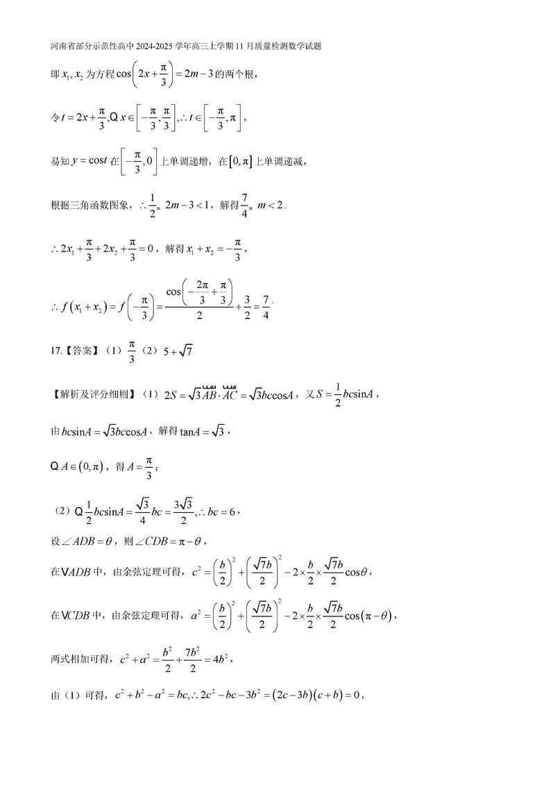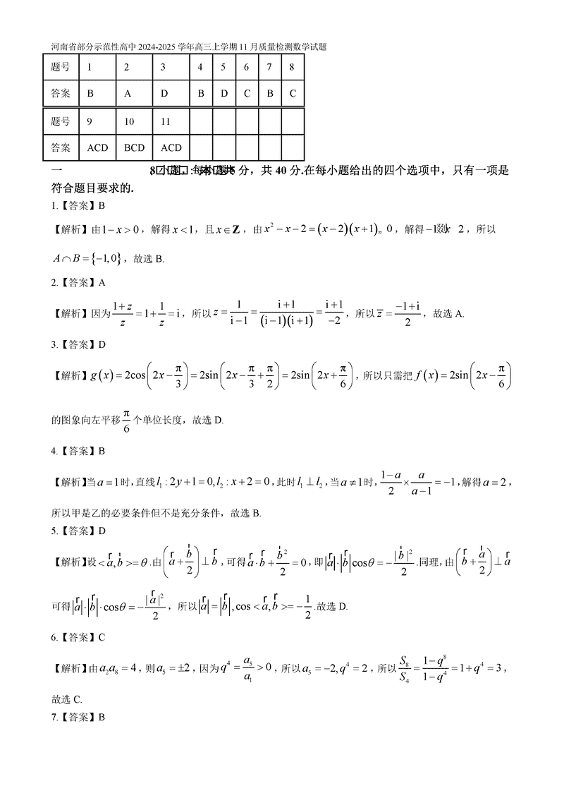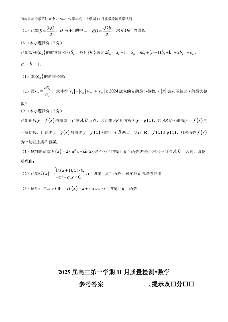 河南部分示范性高中2024年11月高三上期中数学试题及答案
