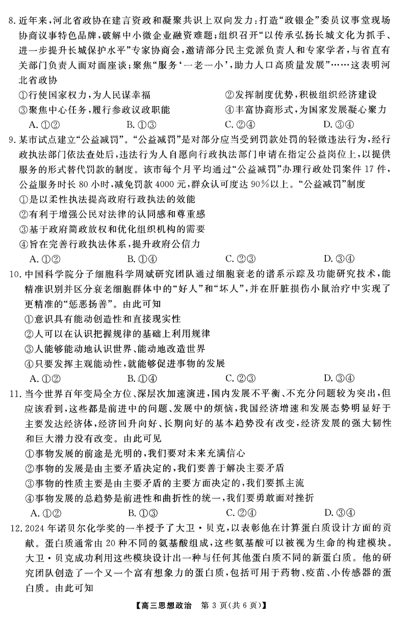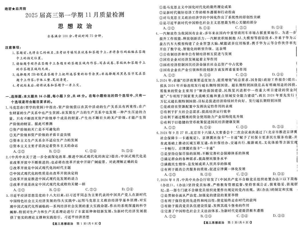 河南部分示范性高中2024年11月高三上期中政治试题及答案