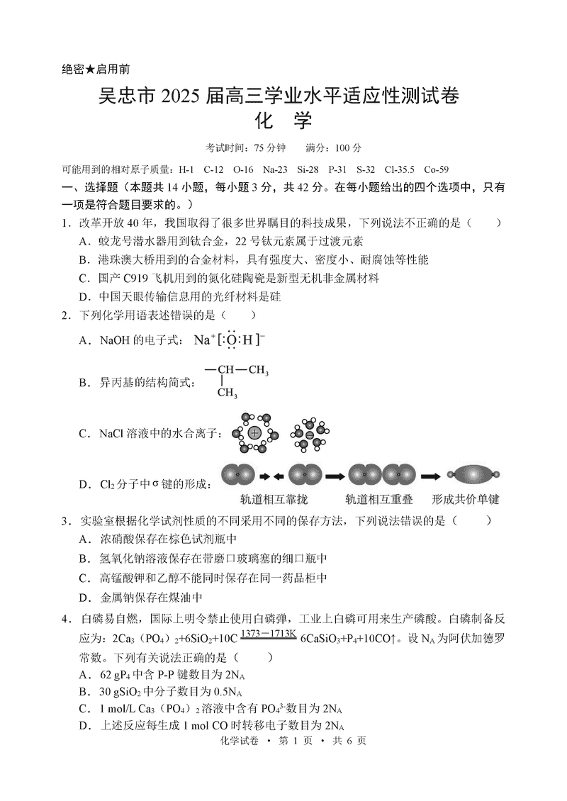 宁夏吴忠市2025届高三上学期学业水平适应性测试化学考试已于近日开考,为方便考生考后及时查看考试情况,查漏补缺、弥补不足,本文整理了试题答案解析相关信息!