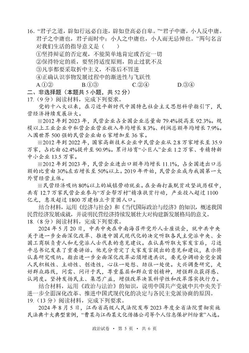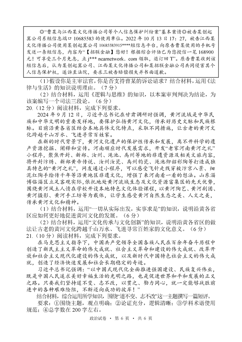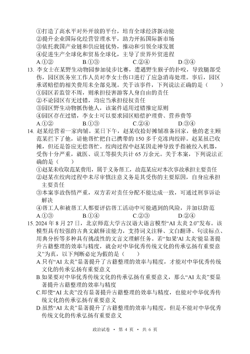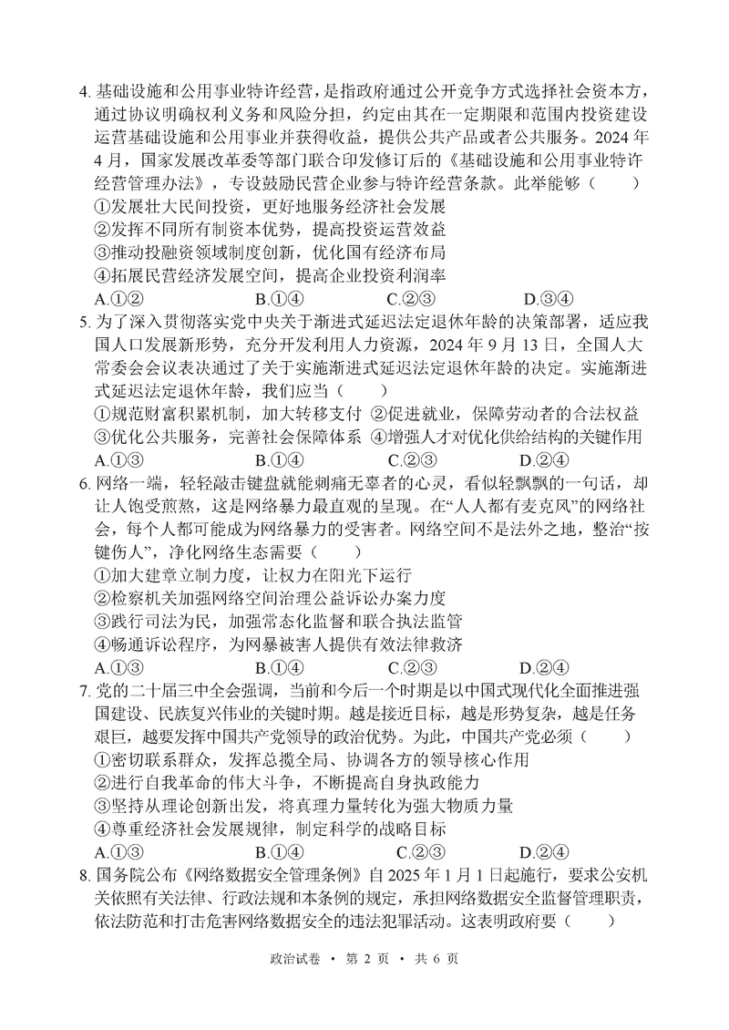 宁夏吴忠市2025届高三上学期学业水平适应性测试政治试题及答案