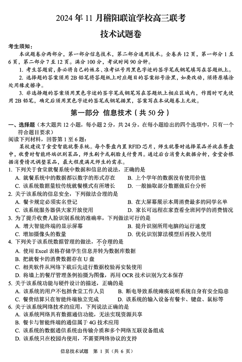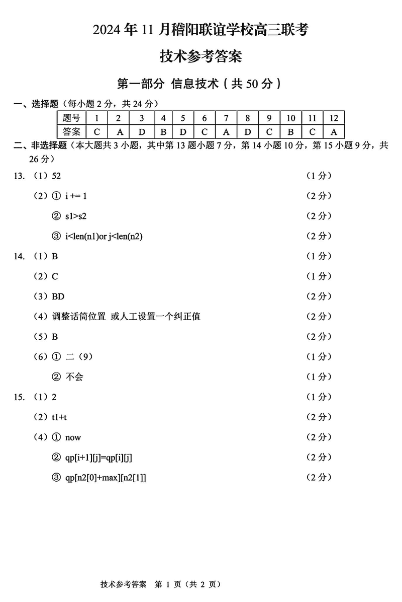 浙江稽阳联谊学校2024年11月高三上学期联考技术试题及答案
