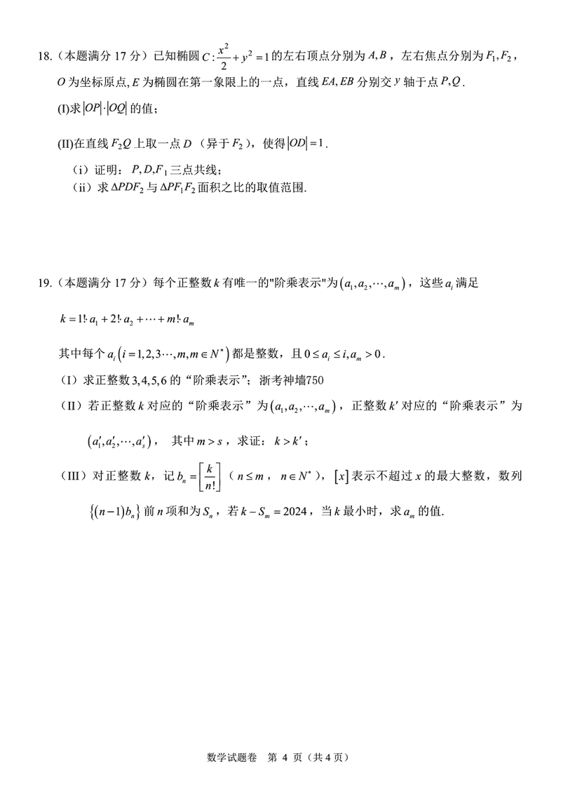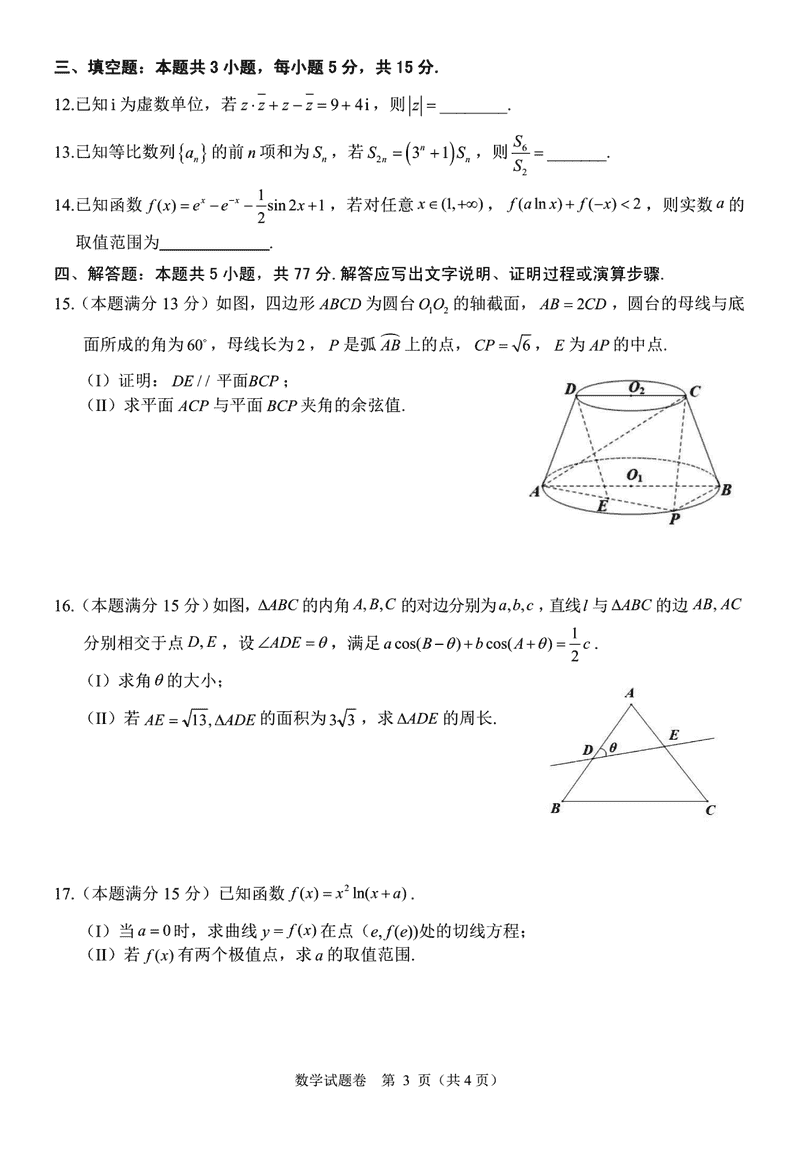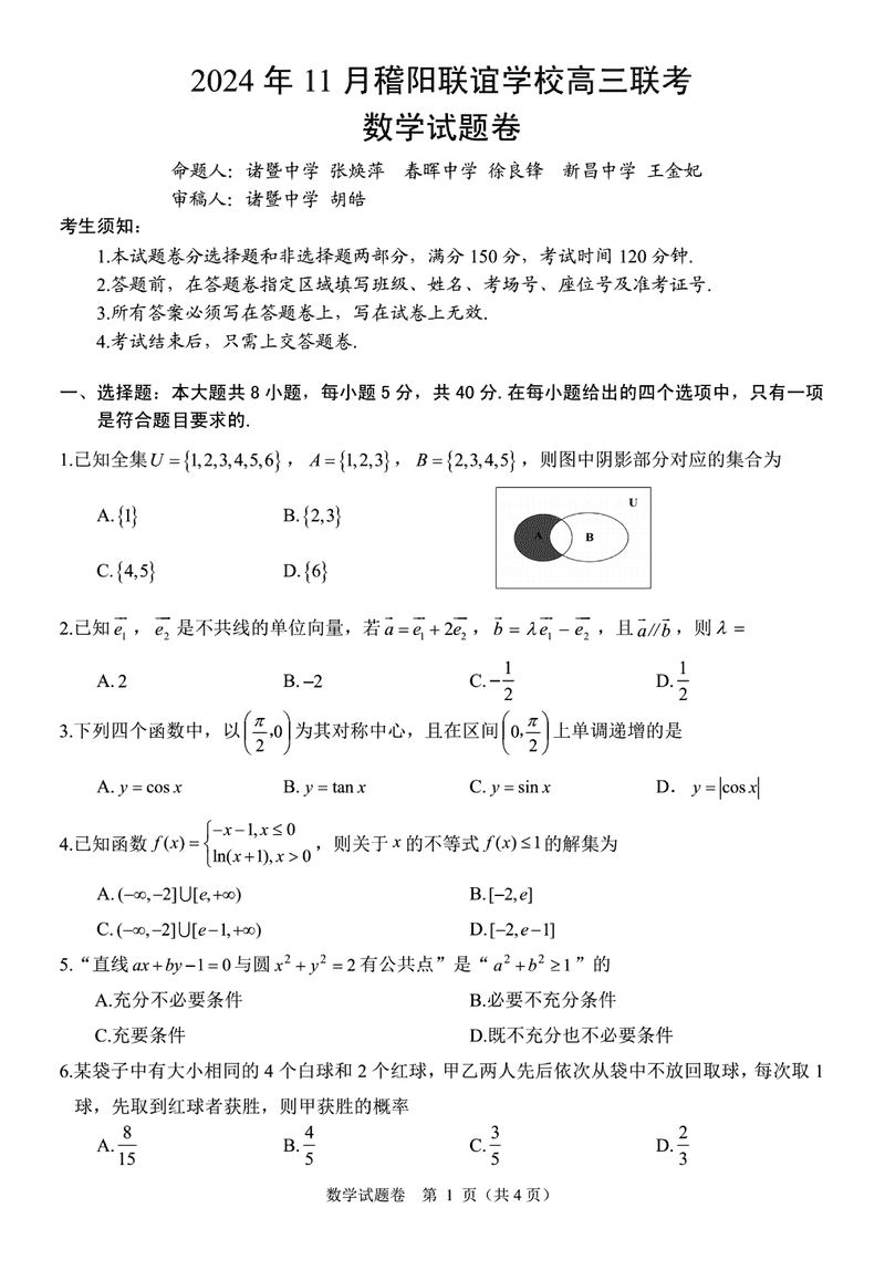 浙江稽阳联谊学校2024年11月高三上学期联考数学试题及答案