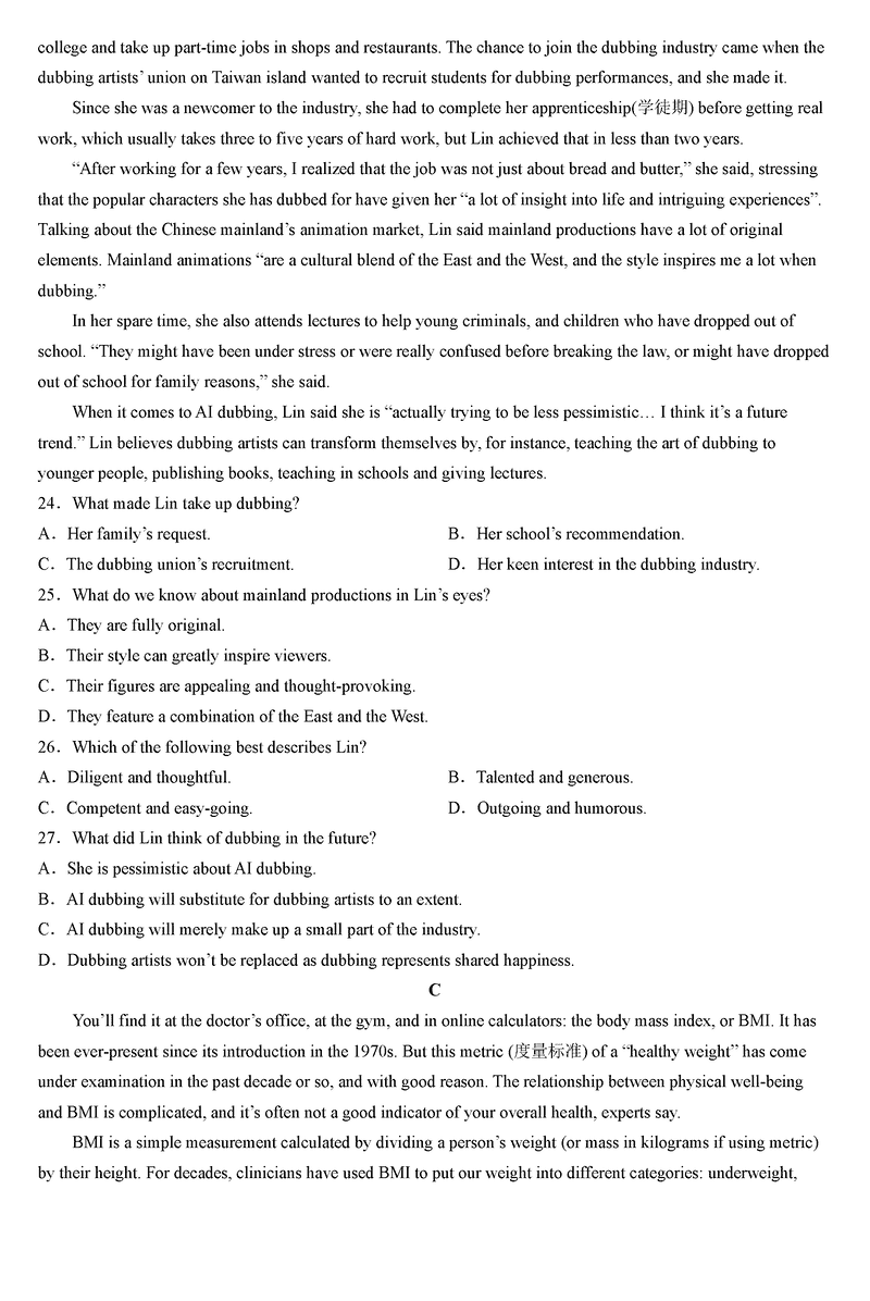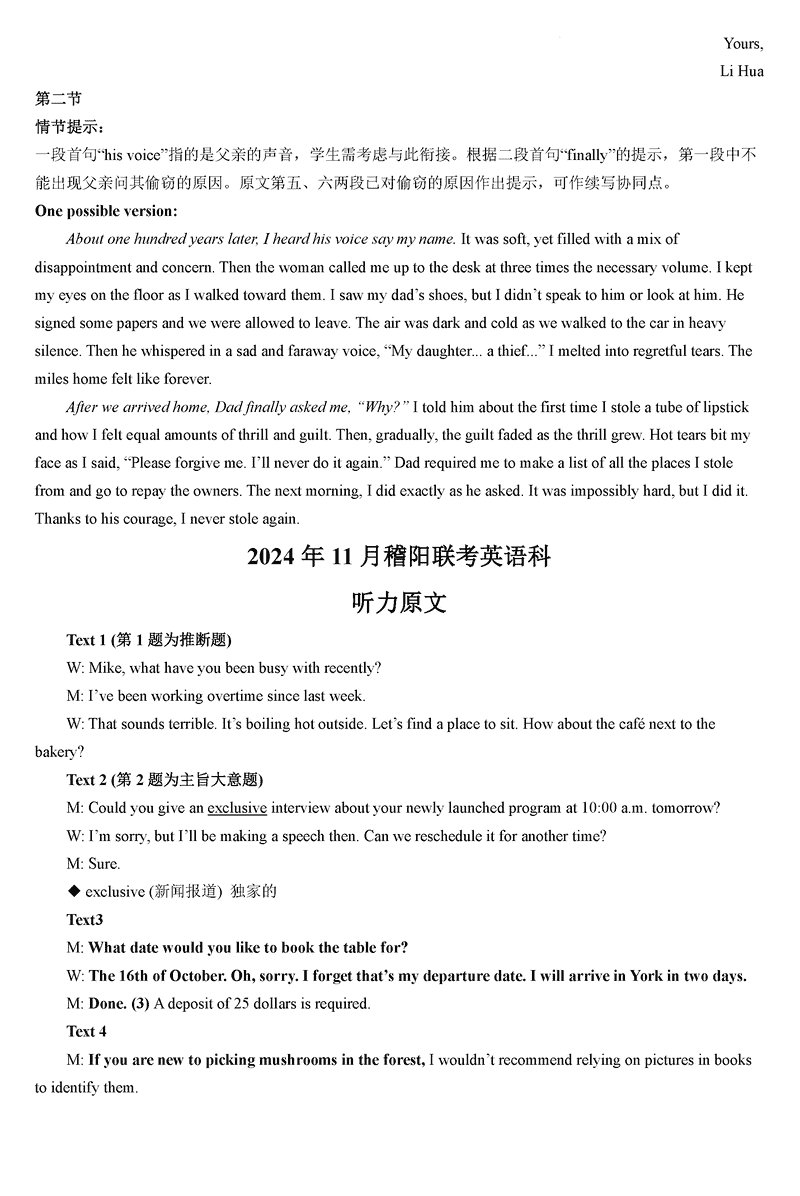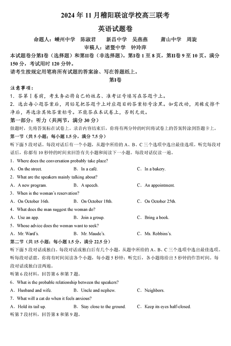 浙江稽阳联谊学校2024年11月高三上学期联考英语试题及答案