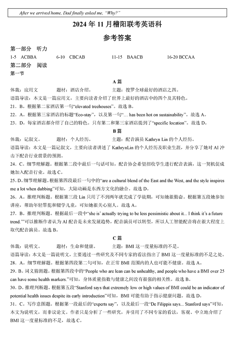 浙江稽阳联谊学校2024年11月高三上学期联考英语考试已于近日开考,为方便考生考后及时查看考试情况,查漏补缺、弥补不足,本文整理了试题答案解析相关信息!