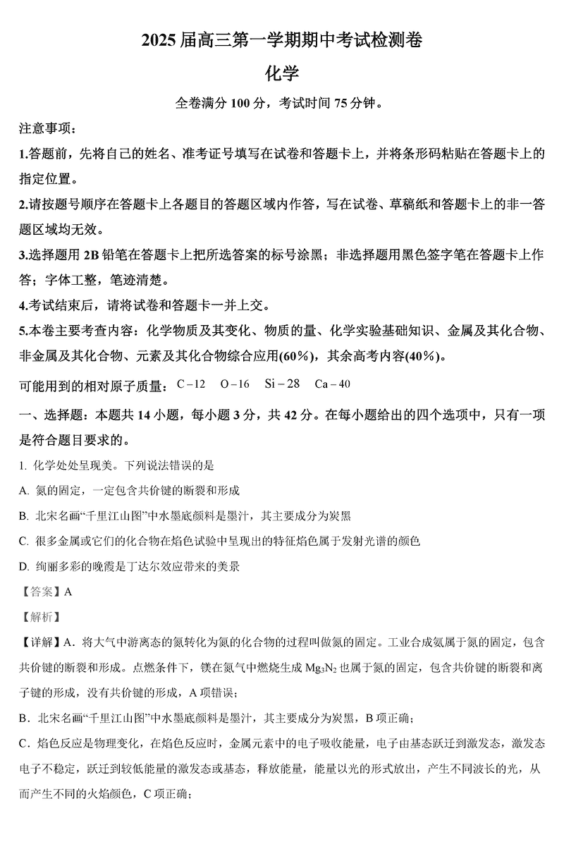 陕西十七校联考2025届高三上学期11月期中化学考试已于近日开考,为方便考生考后及时查看考试情况,查漏补缺、弥补不足,本文整理了试题答案解析相关信息!